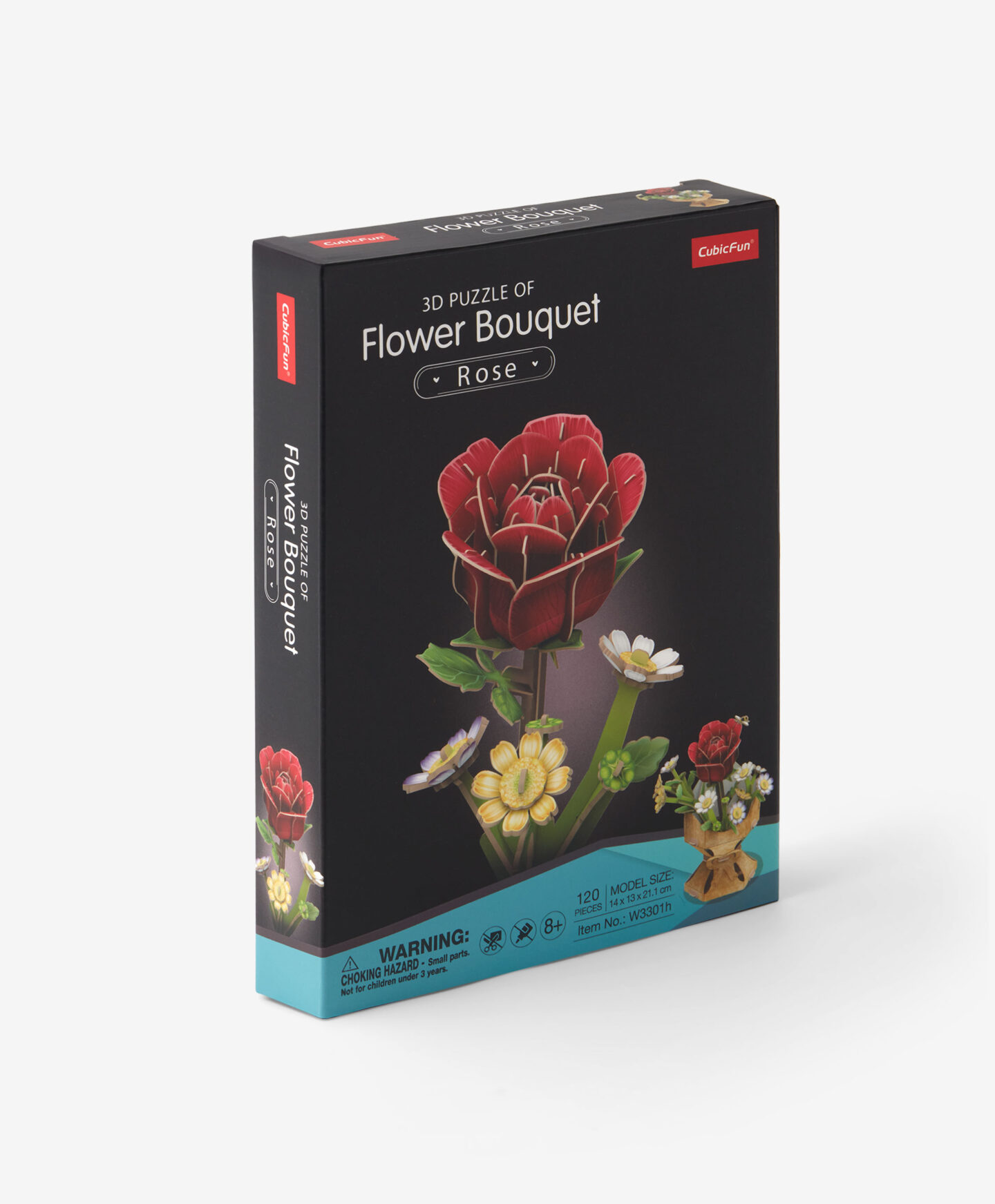 3D puzzle – Kytice s růží představuje kompozici s tmavě červenou růží, jejíž hloubka barvy dodává celku eleganci. Jednotlivé prvky do sebe zapadají a vytvářejí realistické tvary okvětních lístků a zelených doplňků. Obal stabilizuje konstrukci a výsledný efekt je příjemný jako dekorace.