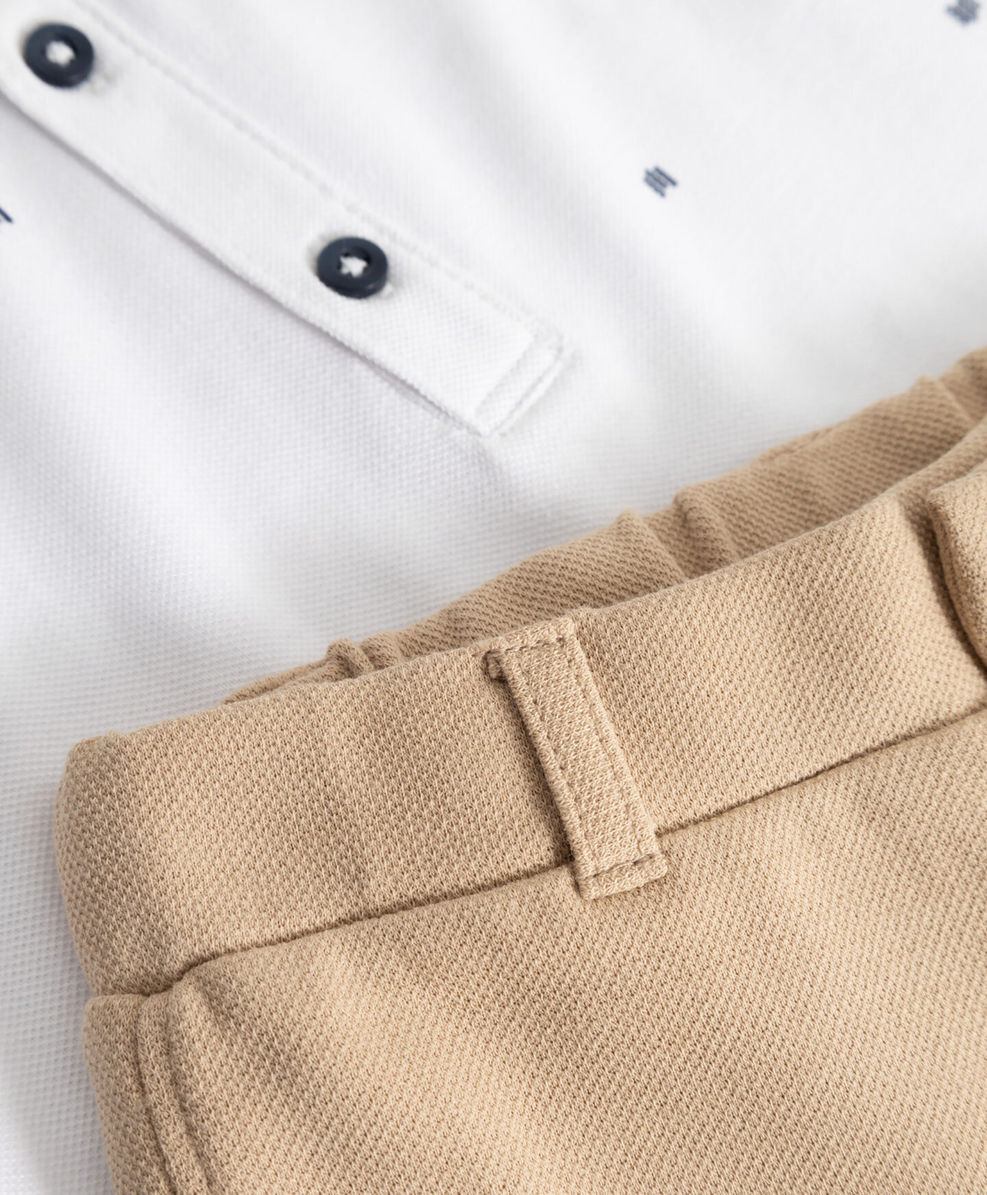 Tato chlapecká souprava obsahuje pohodlné kalhoty a polokošili. Je to hotový outfit pro vašeho drobečka, který můžete v chladnějších dnech doplnit kardiganem z kolekce. Měkoučké, k pokožce šetrné materiály z ní dělají perfektní volbu od narození. Tato souprava je ideální na každodenní nošení i speciální příležitosti. Je to také skvělý dárek pro stylové děťátko.
