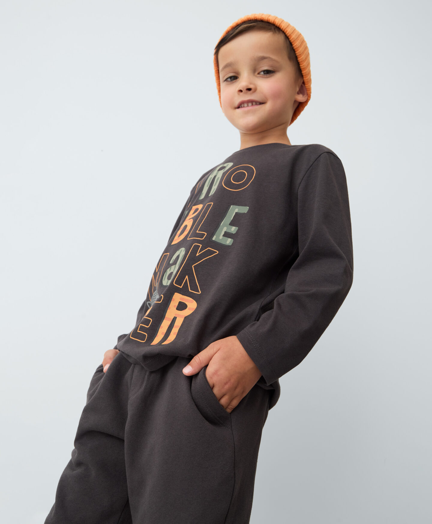 Chlapecké tepláky s vysokým podílem bavlny jsou nezbytností v každém podzimním šatníku. Jsou zakončené elastickými manžetami a nabízí teplo a pohodlí. Materiál šetrný k pokožce jemně obepíná tělo a zajišťuje pohodlí při každém pohybu. K dispozici je perfektně ladící tričko s dlouhým rukávem.