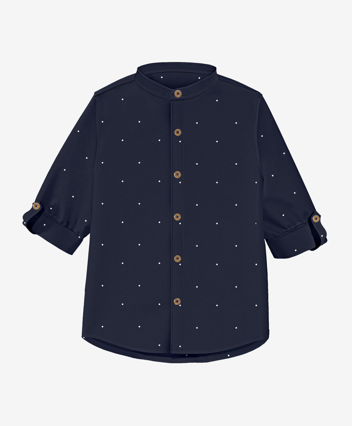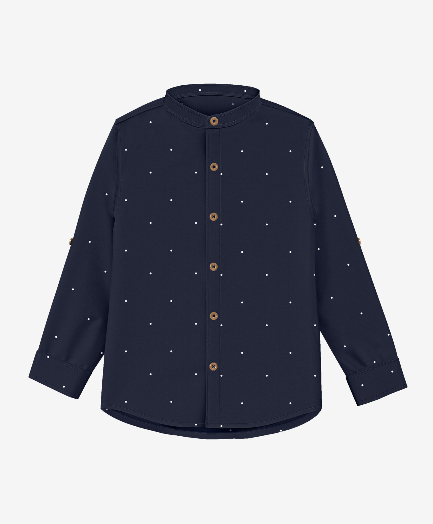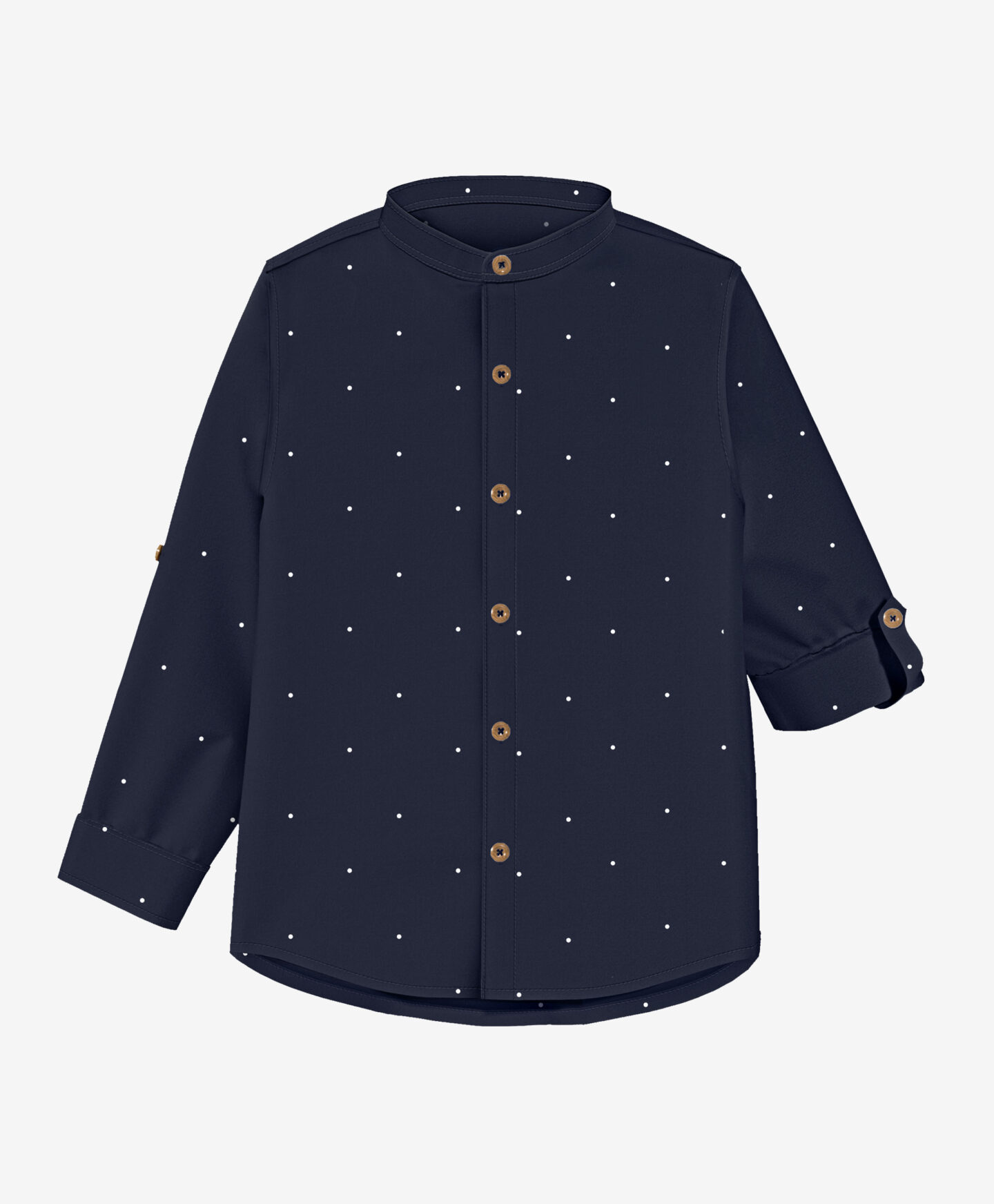 Chlapecké tričko s puntíky je vhodné na formální příležitosti. Malý stojatý límec dodává modelu charakter a styl. Dlouhé rukávy lze ohrnout a zapnout knoflíkem. Klasická námořnická modrá barva košile se bude hodit ke světlým i tmavým kalhotám.