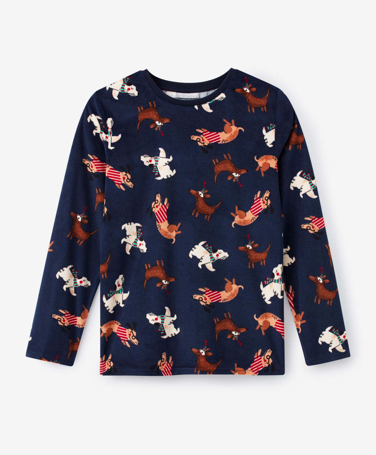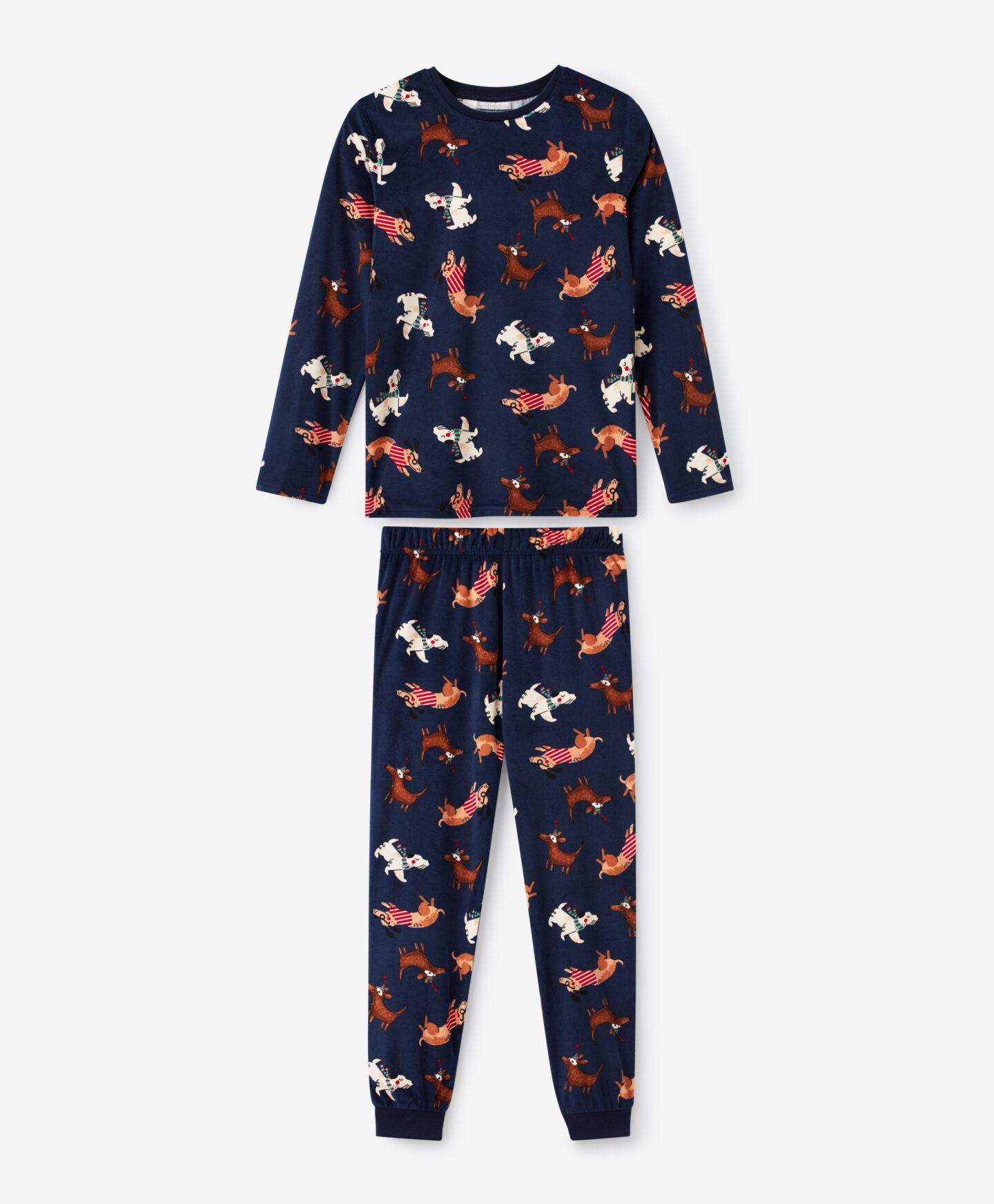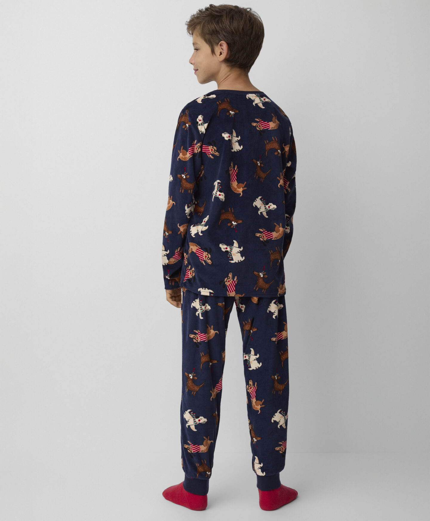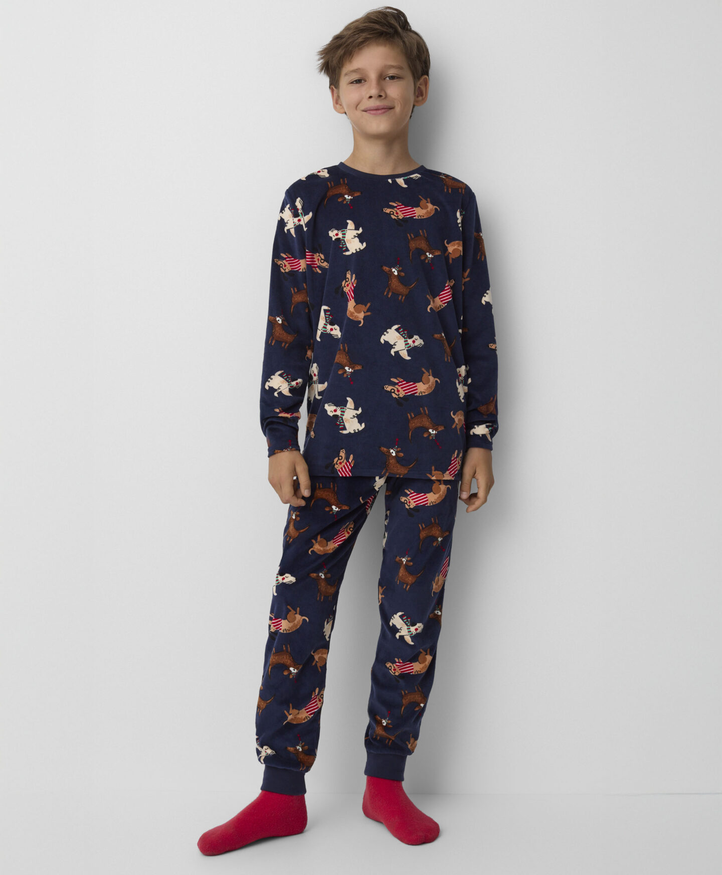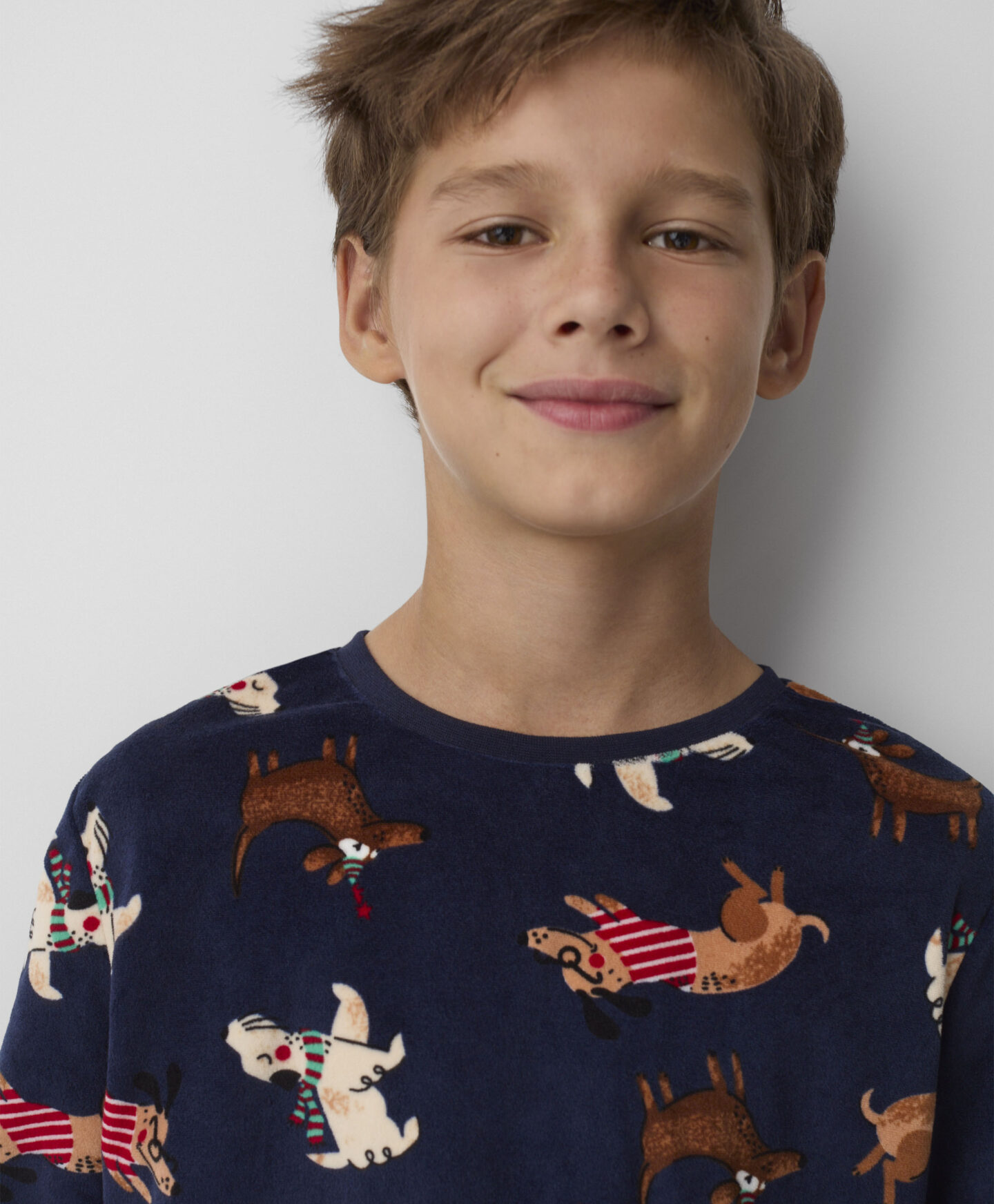 Chlapecké velurové pyžamo s pejsky poskytuje pohodlí při spánku a svobodu pohybu. Vyrobeno z měkkého a na dotek příjemného veluru, je ideální na chladnější noci. Zaručuje teplo a jemnost. Hravé vzory s motivy pejsků si oblíbí každý kluk.