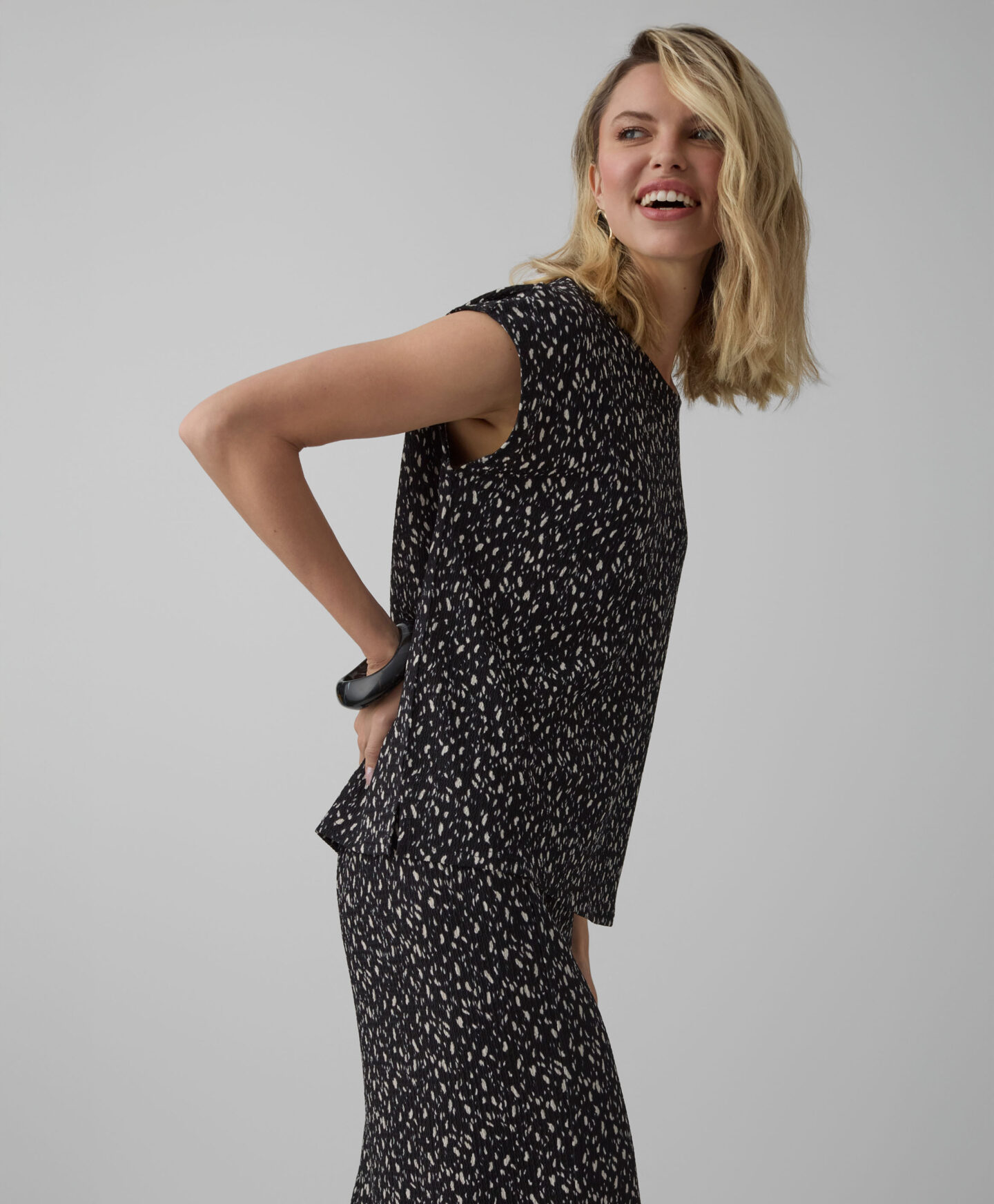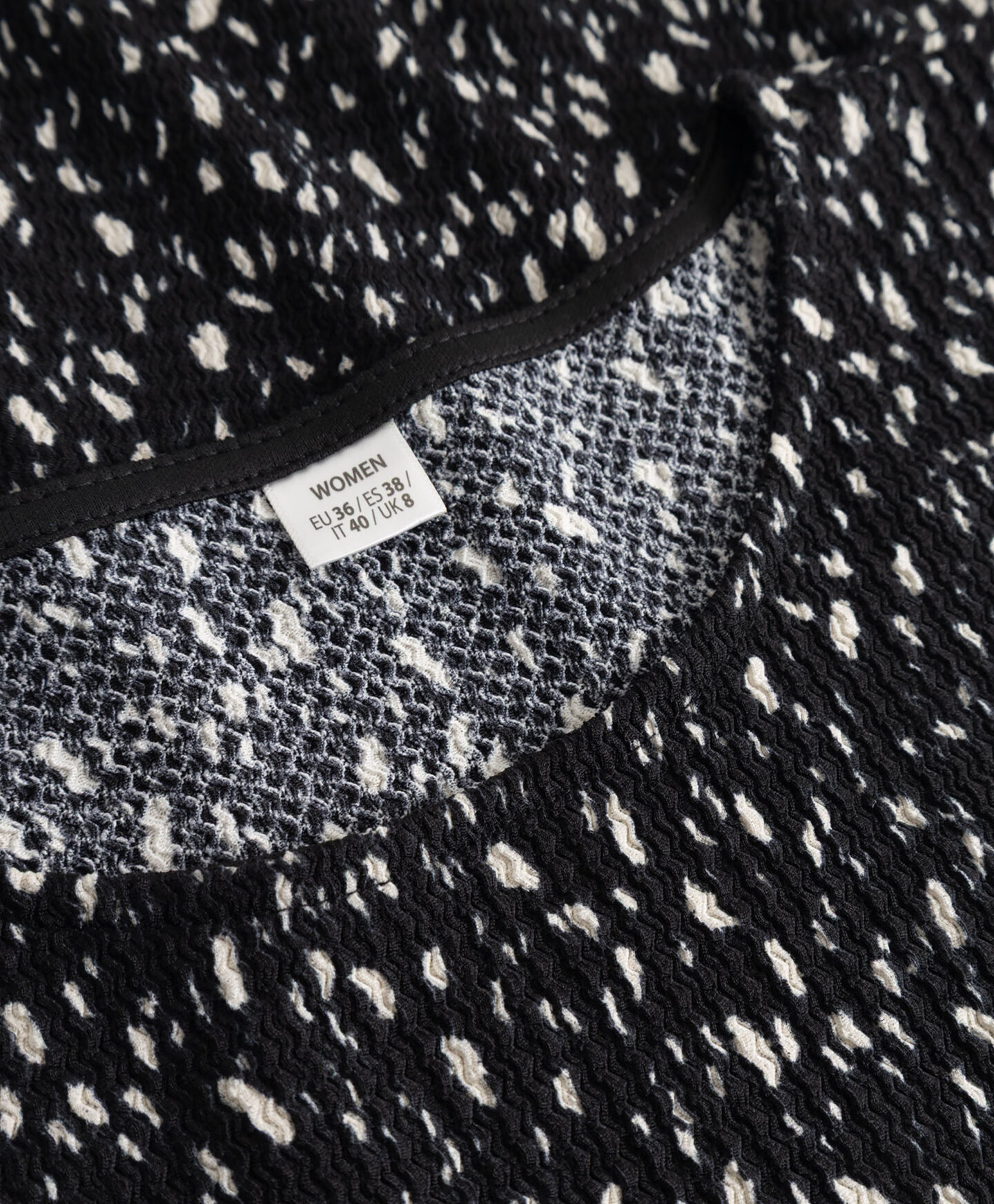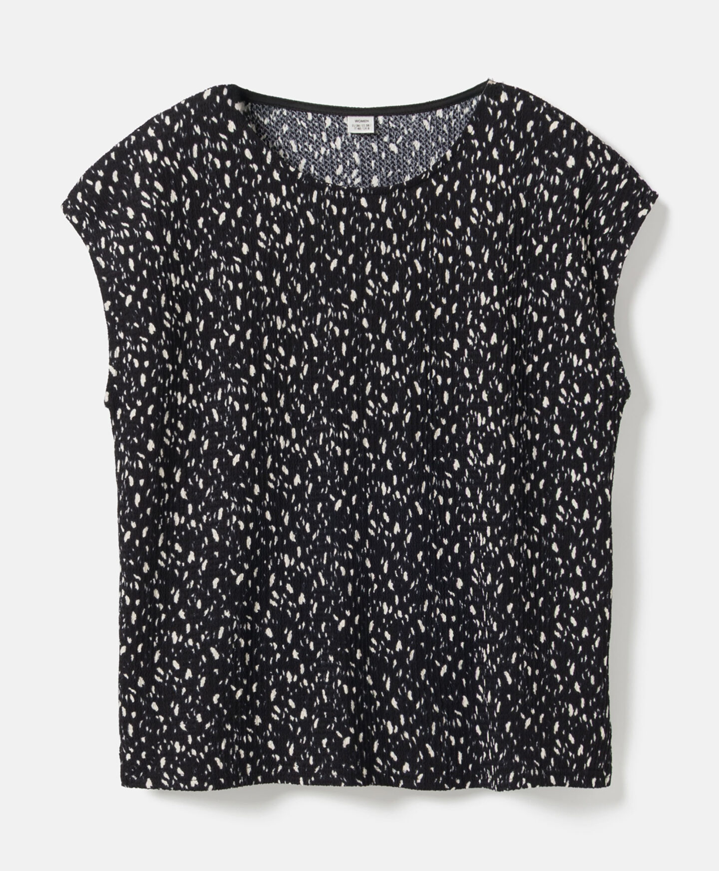 Dámská černá vzorovaná košile s pokrčeným vzhledem tvoří soupravu se sukní z kolekce. Můžete ji však libovolně kombinovat také s vašimi oblíbenými džínami nebo elegantnějšími kalhotami. Krátký rukáv je ideální pro vrstvení v přechodných obdobích. Hodí se ke klasické bundě i k jednobarevnému kardiganu.