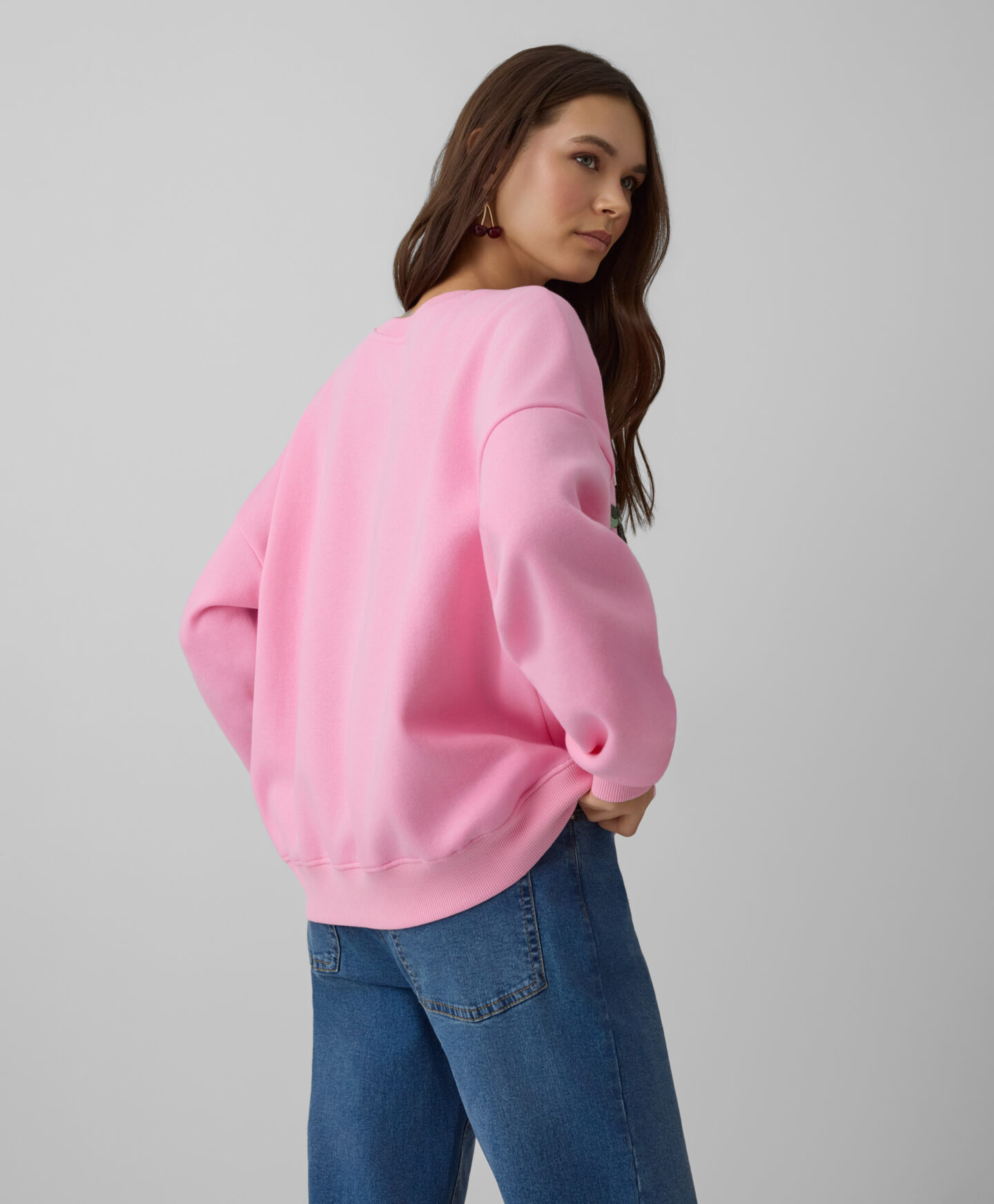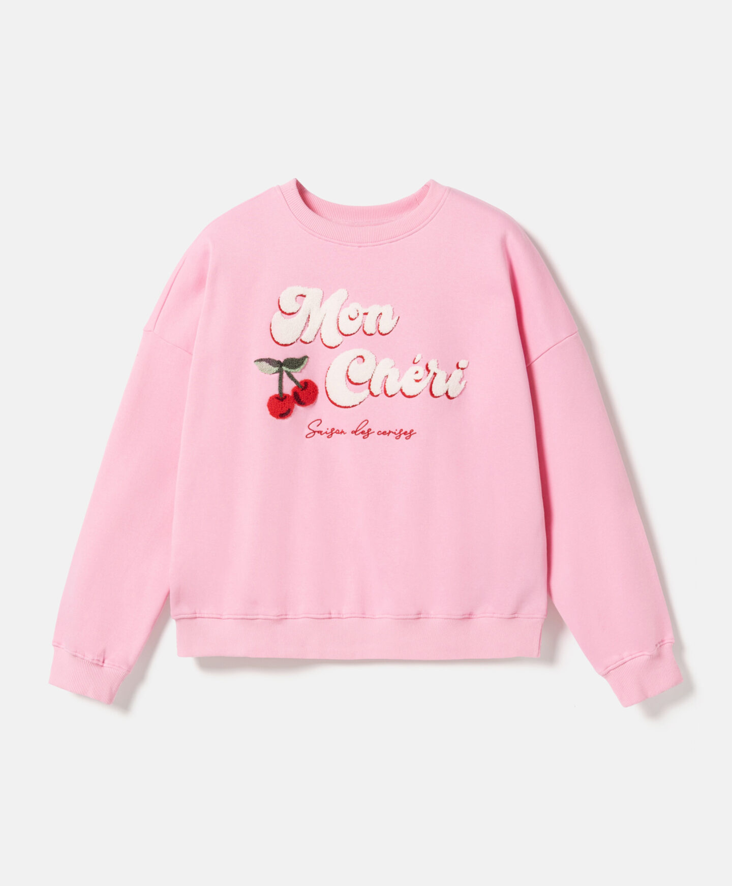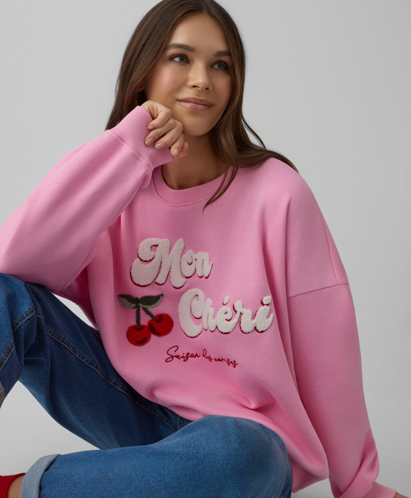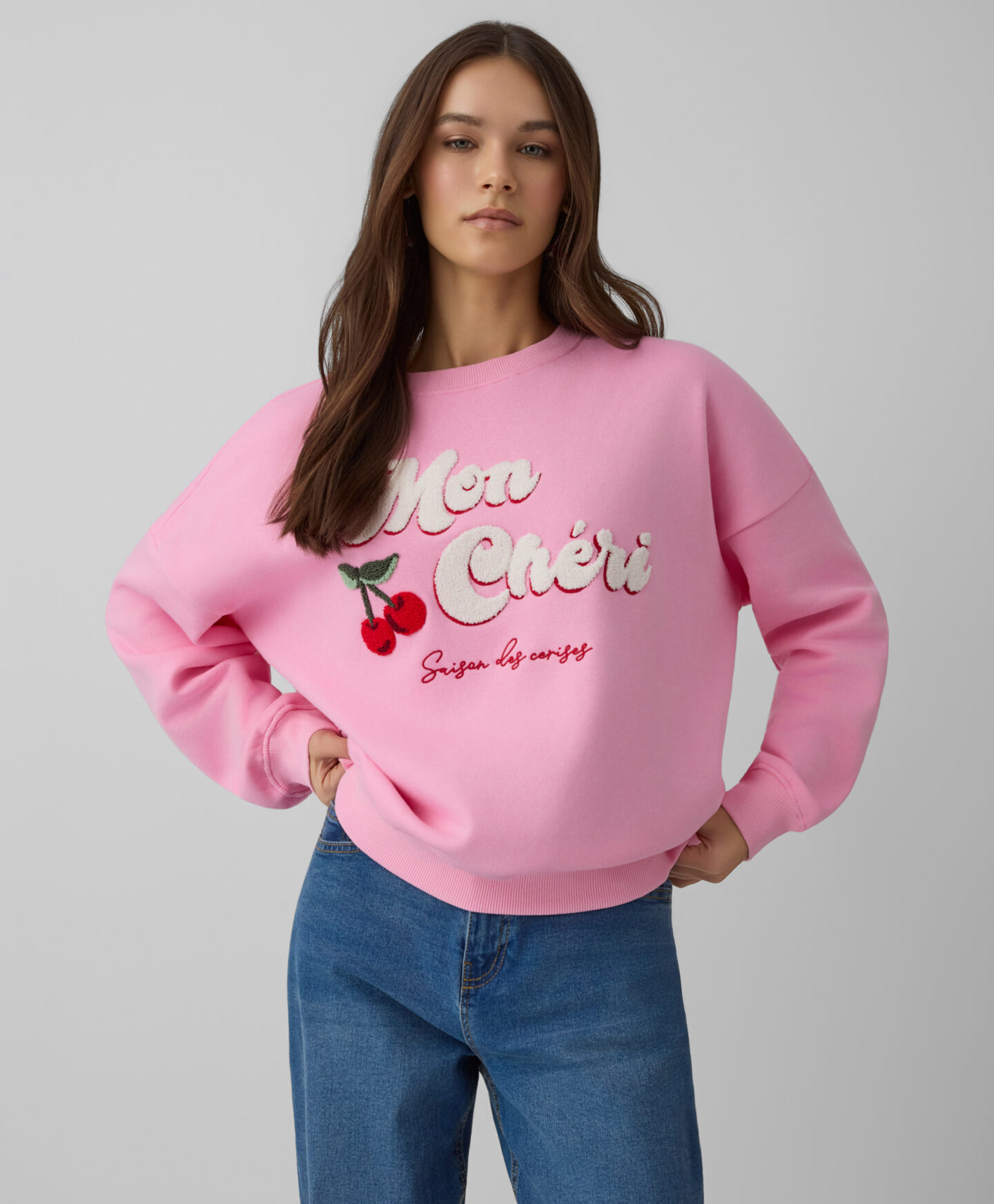 Dámská mikina s froté aplikací je vyrobená z měkkého bavlněného materiálu. Jemně obepíná pokožku, je hřejivá a odolná vůči praní. Potisk třešní na přední straně jí dodává šarm. Hodí se k džínám i teplákům.