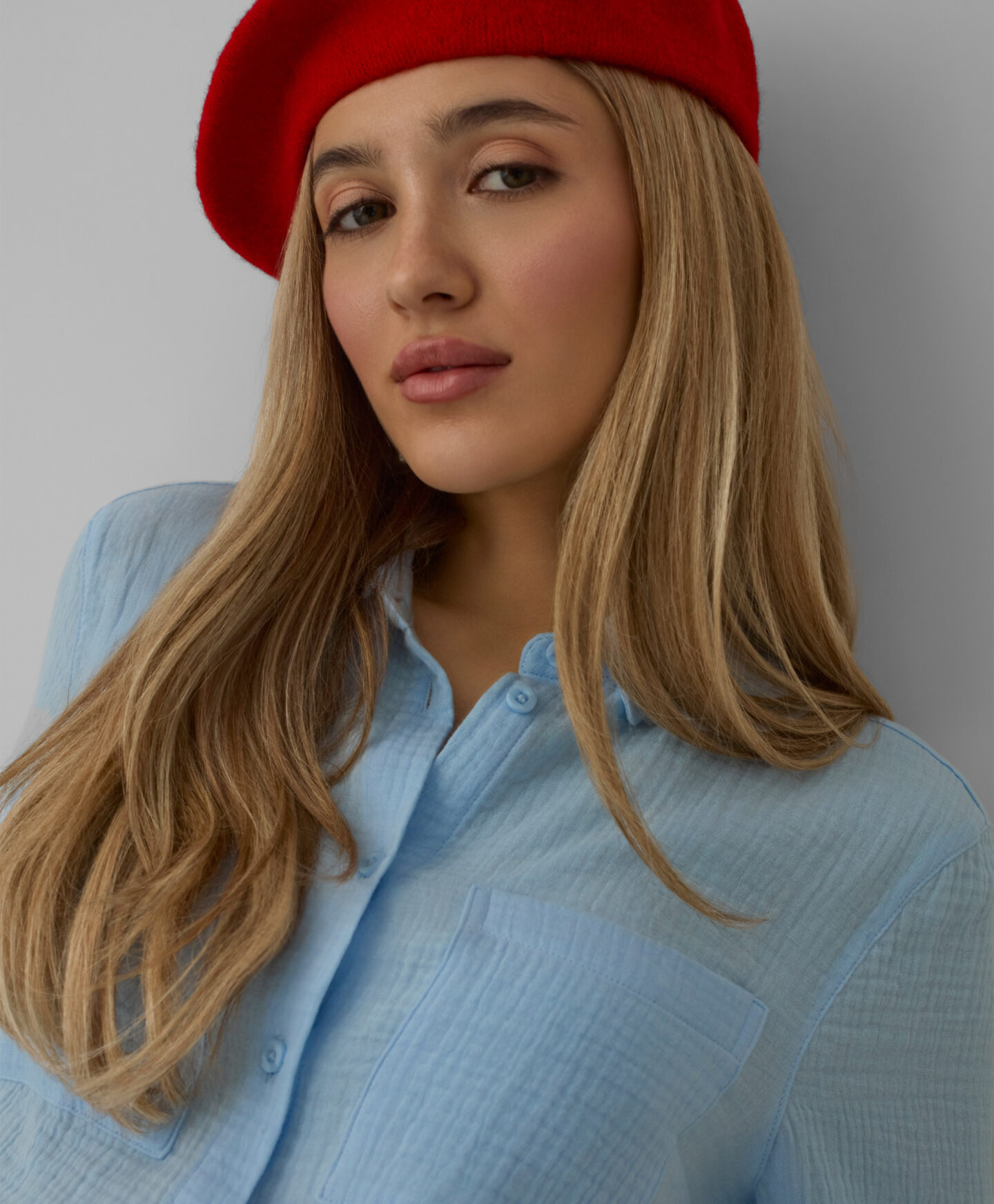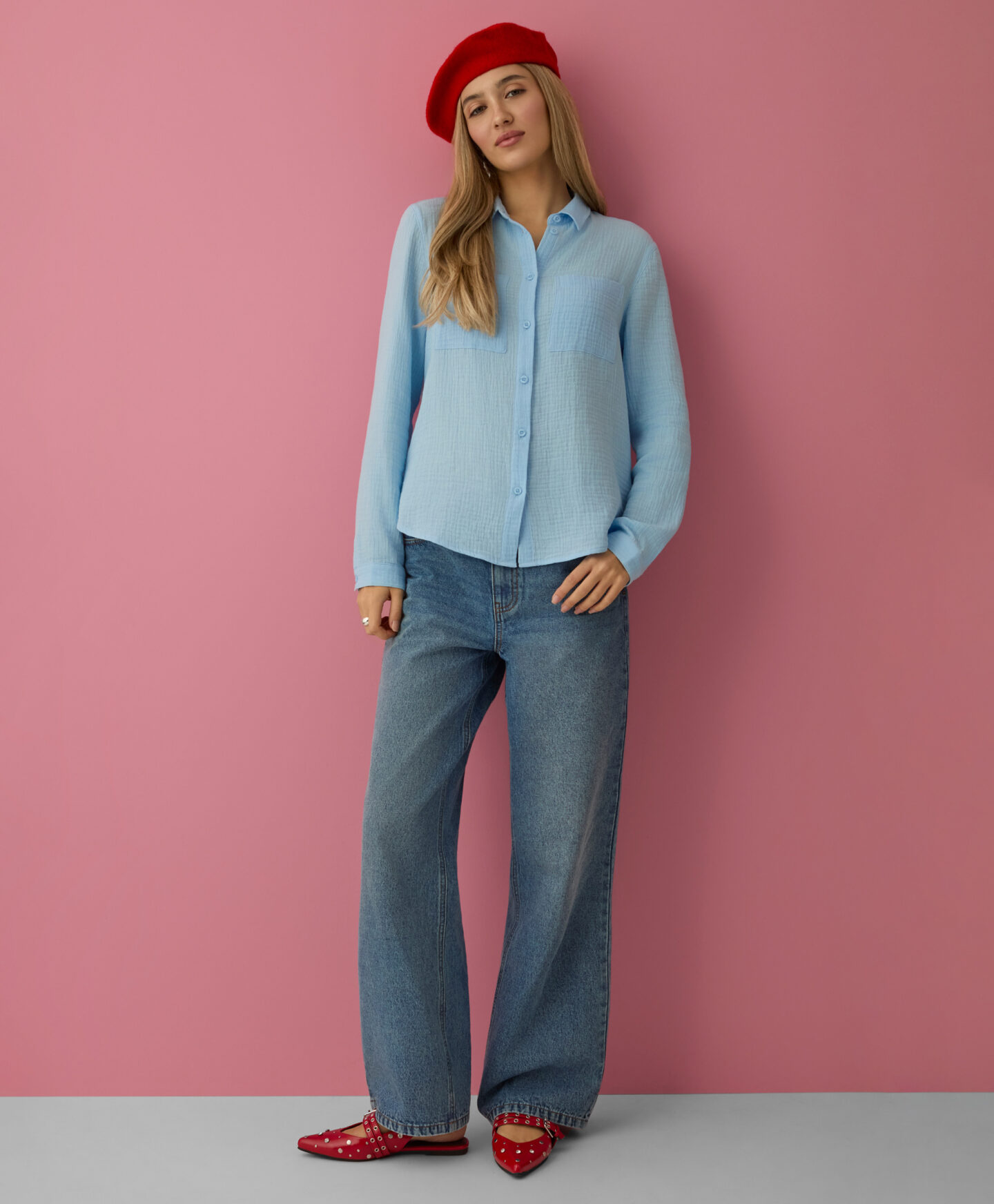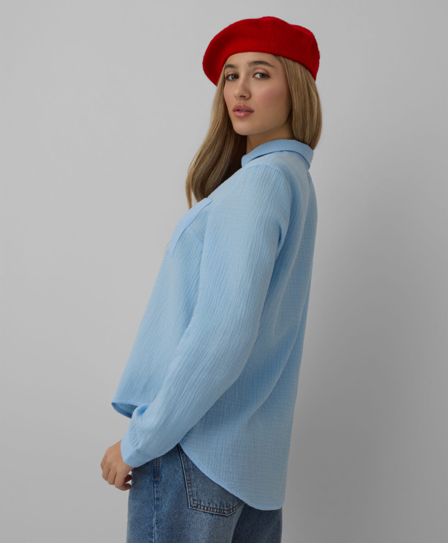 Dámské mušelínová košile ze 100% bavlny je perfektní volbou pro ženy si cení přírodních materiálů. Lehký a prodyšný mušelín zajišťuje pohodlí při nošení. Je ideální jak k ležérním outfitům s džínami, tak k elegantnějším kompletům.