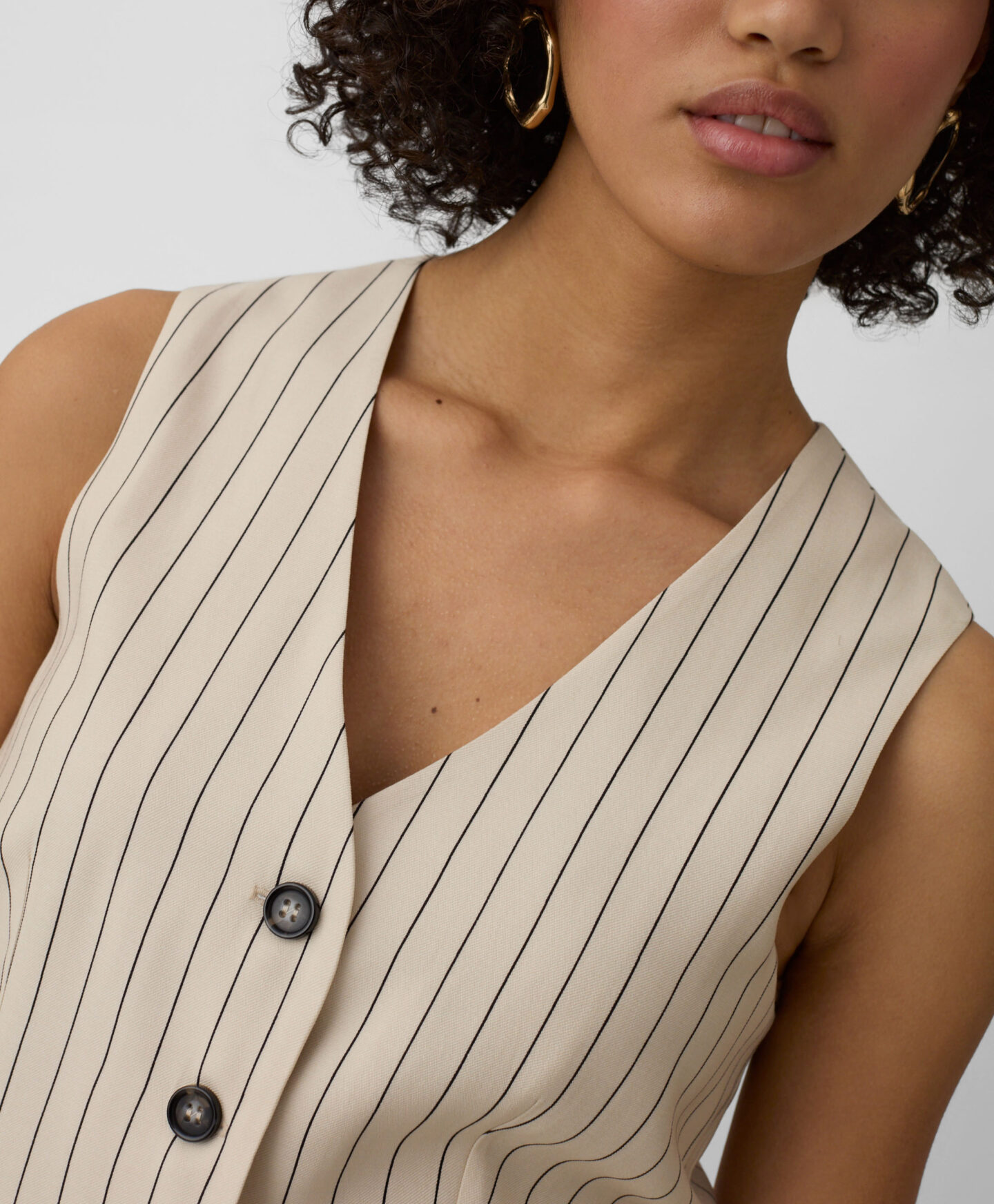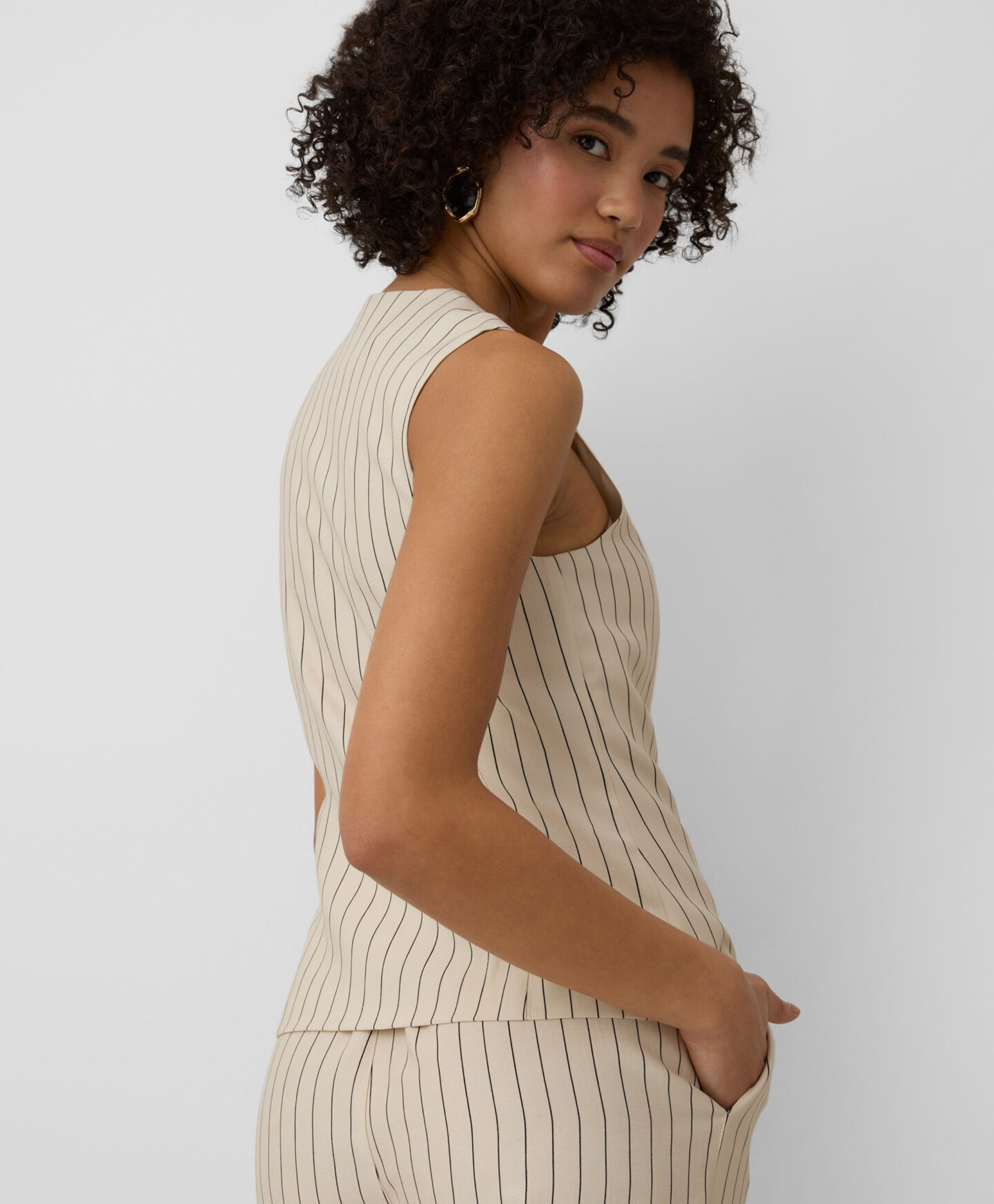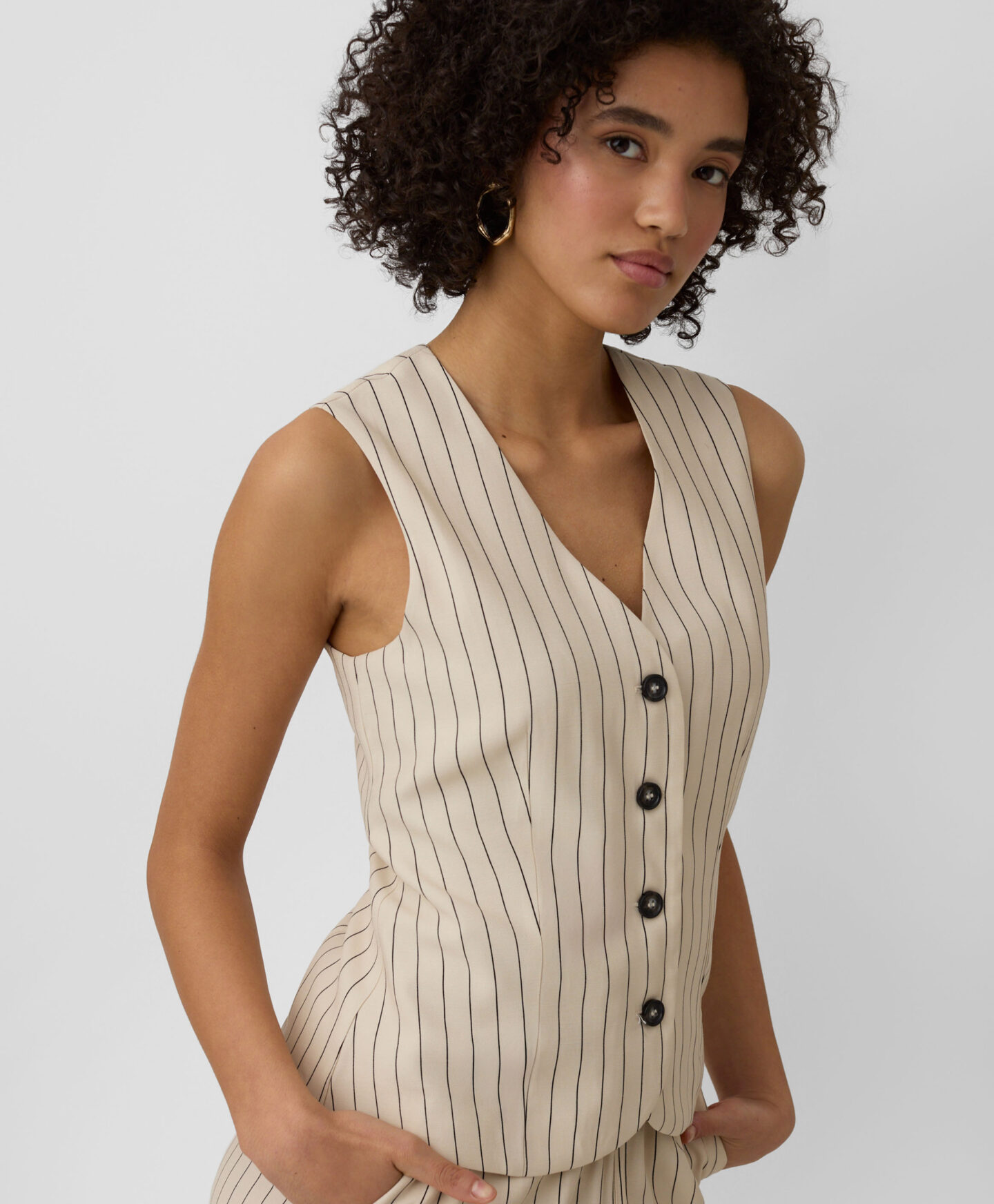 Tato dámská pruhovaná vesta se perfektně hodí ke kalhotám z této kolekce. Díky vysokému obsahu viskózy je vesta lehká, vzdušná a ideální pro teplé dny. Tlumené barevné schéma ji činí neuvěřitelně všestranným pro styling.