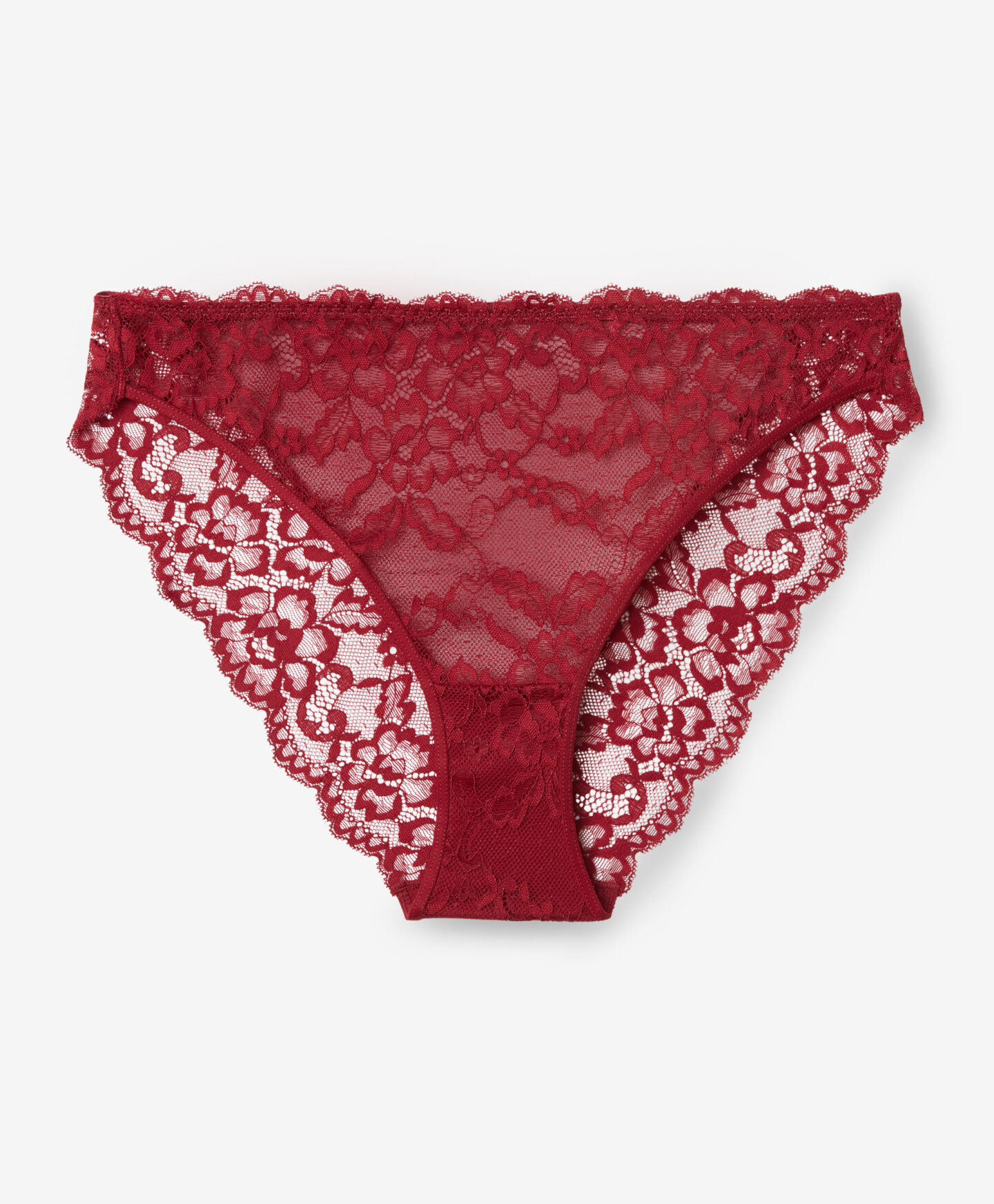 Dámské bordové bikinové kalhotky s krajkou jsou smyslnou volbou, ve které se budete cítit neuvěřitelně žensky. Přídavek elastanu zajišťuje, že kalhotky perfektně sedí a zvýrazňují vaše křivky. Průhledná krajka je vynikající volbou, chcete-li si zvýšit sebevědomí. V nabídce naleznete také top ze stejné kolekce.