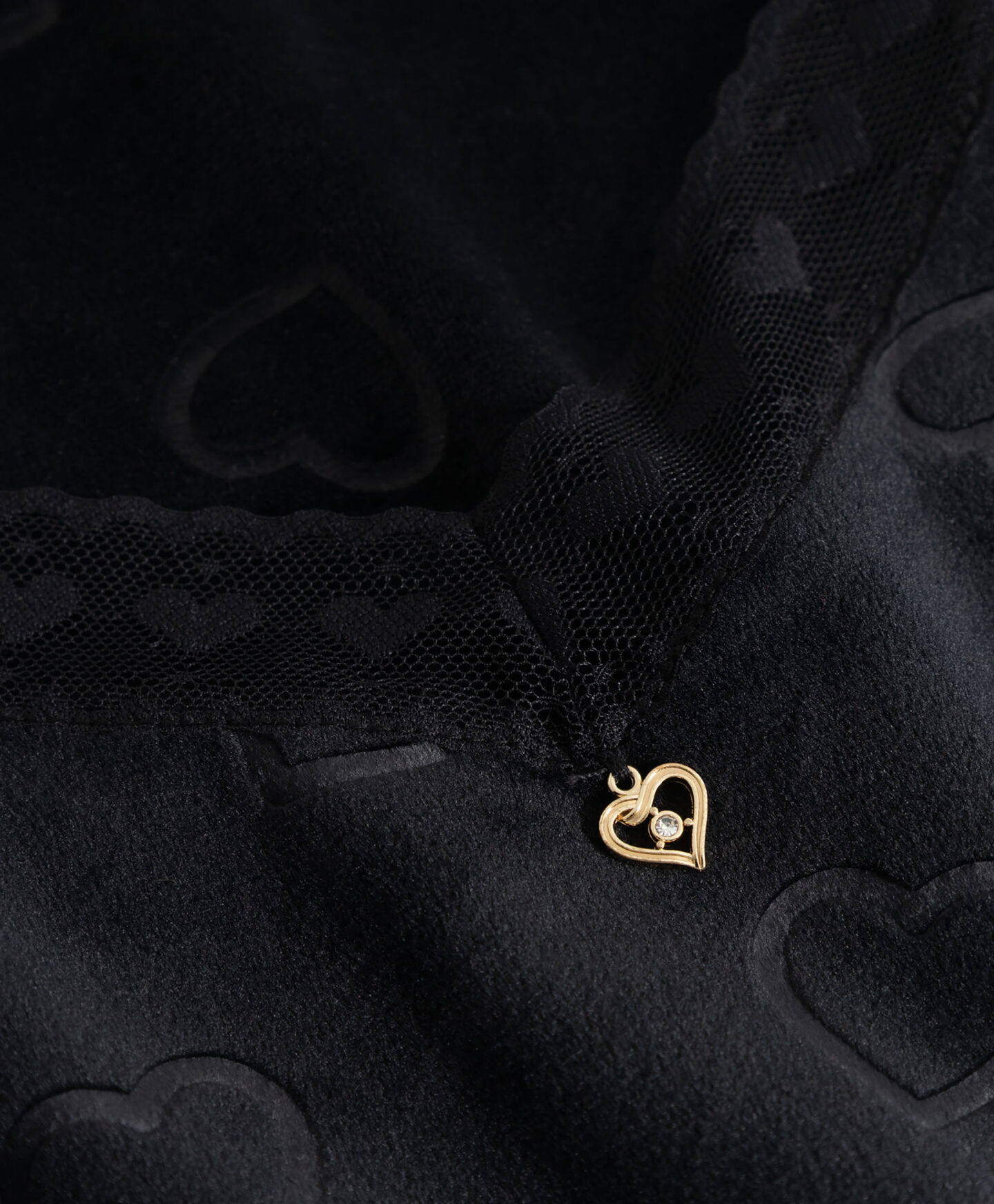 Dámské velurové černé pyžamo s krajkou a 3D potiskem ve tvaru srdce je romantickou volbou na blížící se Valentýn. Souprava obsahuje tílko s tenkými ramínky a šortky, které perfektně sedí a zdůrazňují křivky postavy. V nabídce je na výběr několik barev.