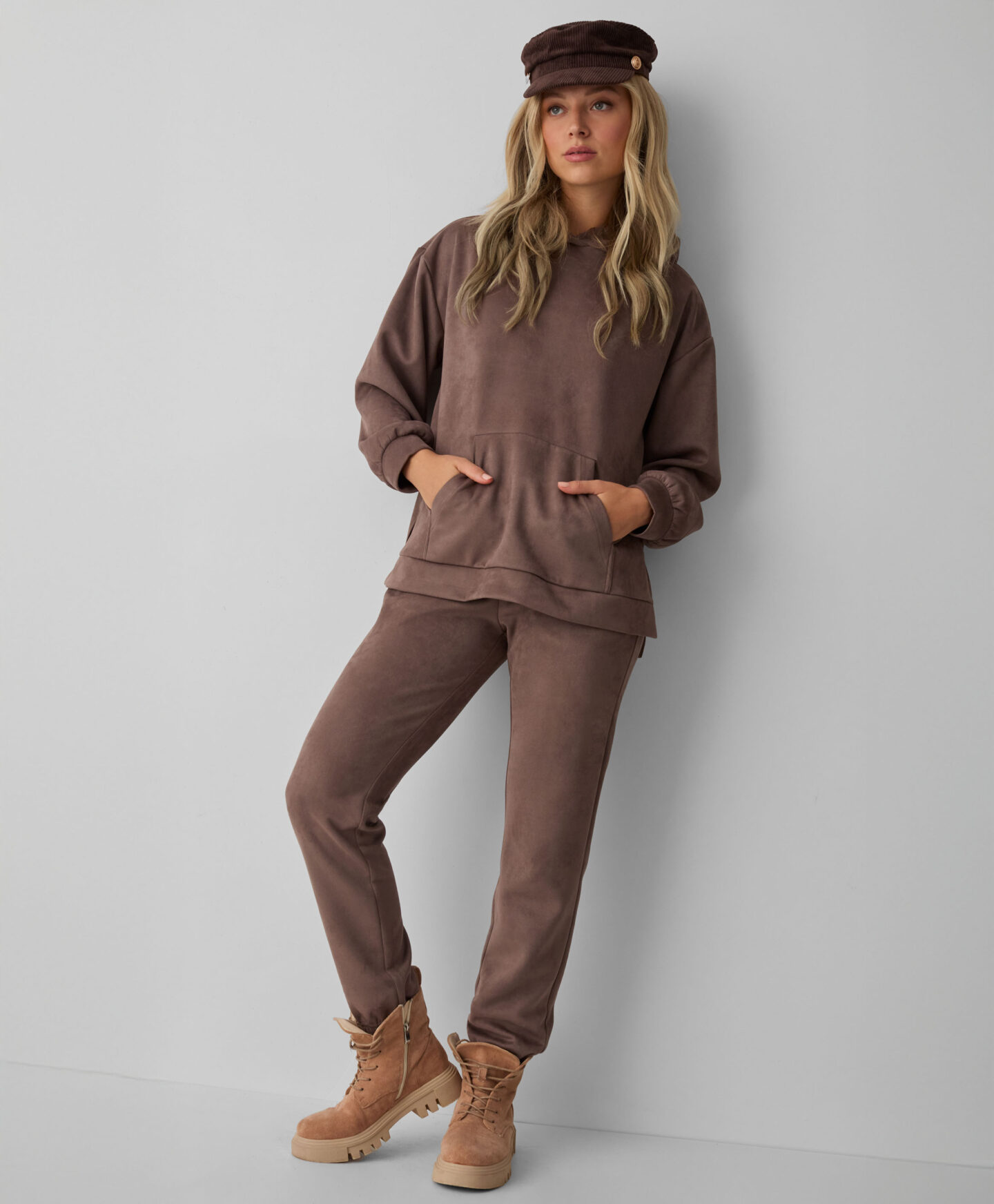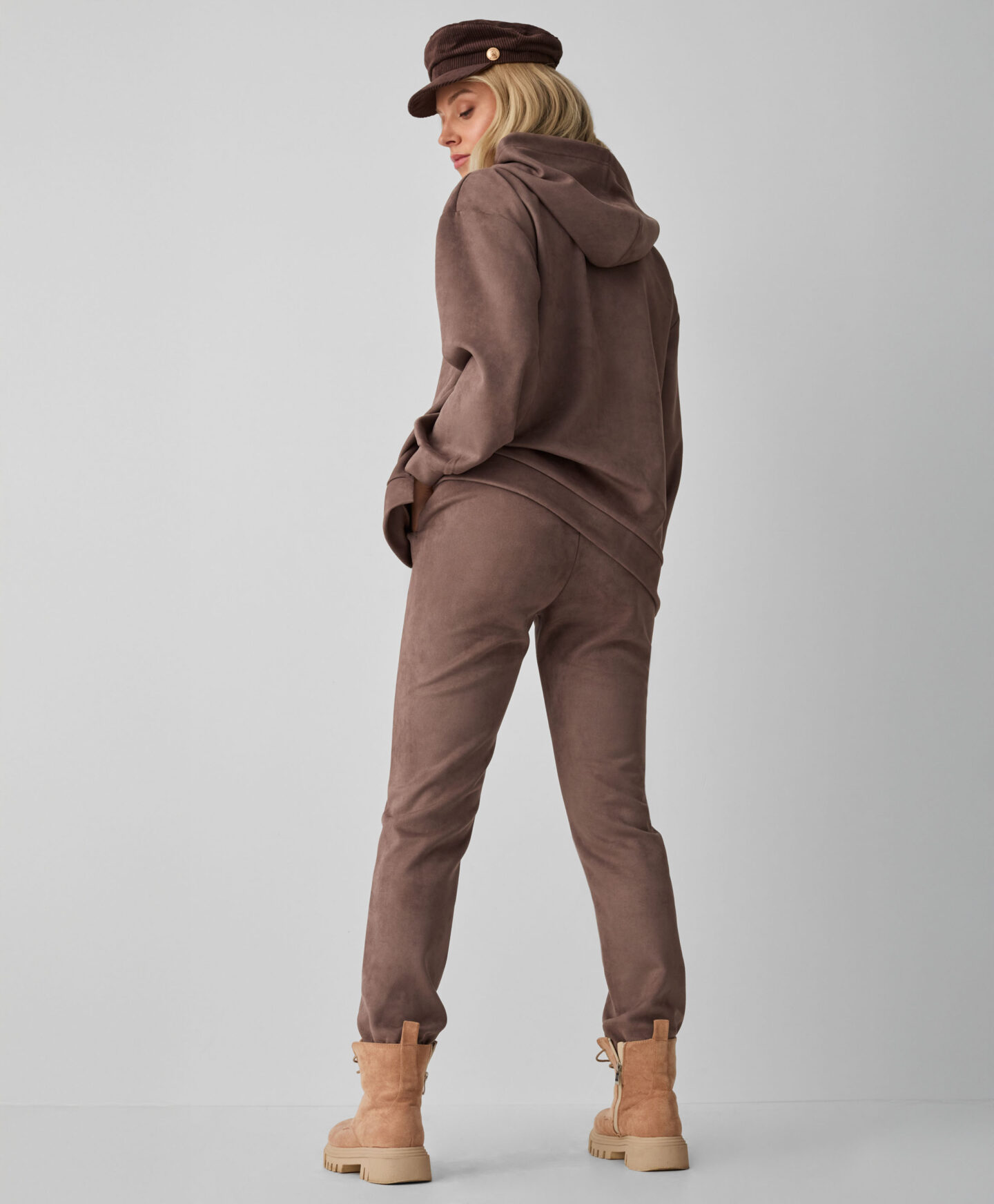 Dámské hnědé semišové kalhoty s kapsami jsou stylovou a pohodlnou volbou na každý den. Kalhoty jsou jemné, příjemné na dotek a budou perfektní na podzimní procházky. Tlumený odstín hnědé se perfektně hodí k mikině s kapucí z této kolekce. Na výběr jsou čtyři varianty.