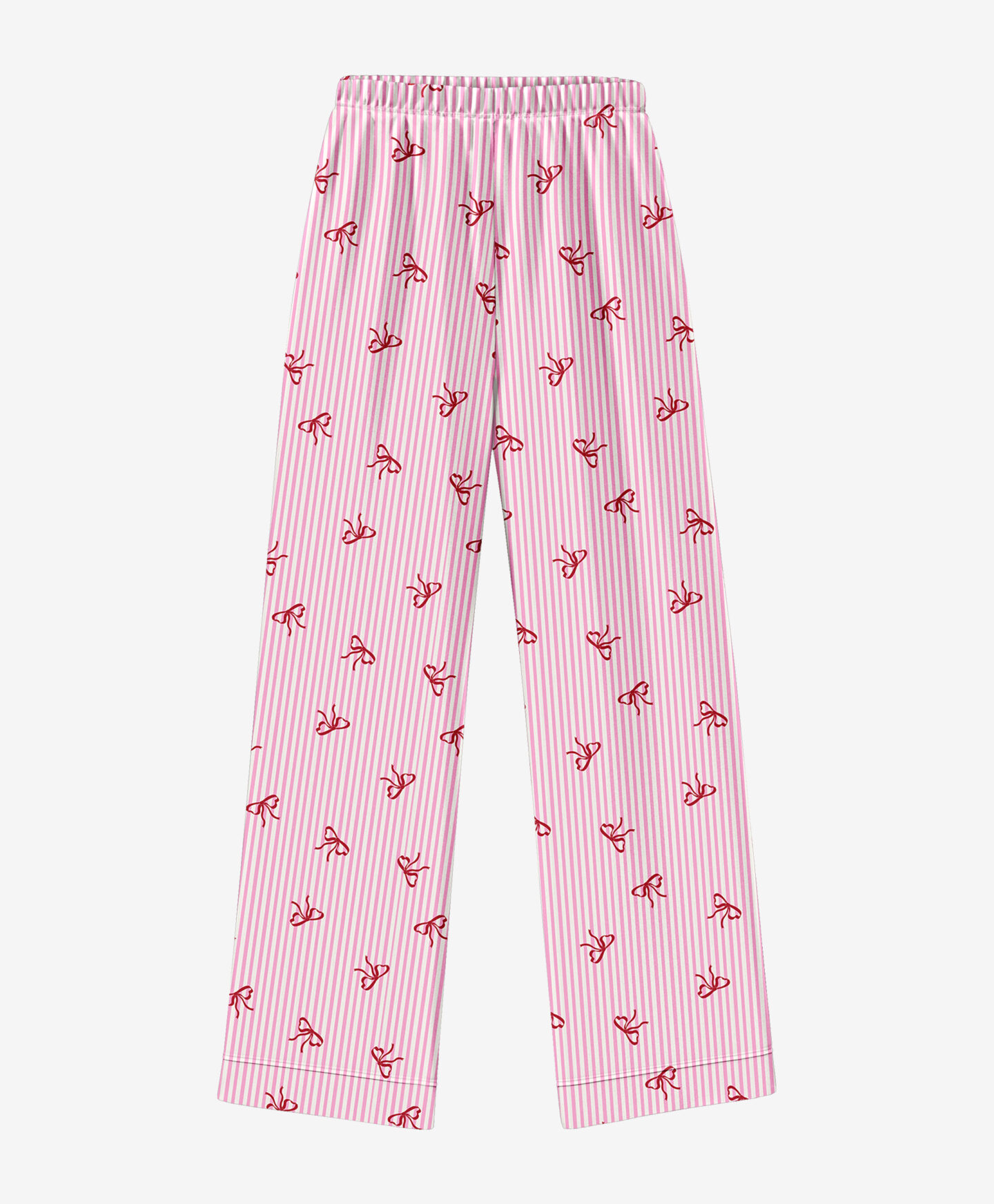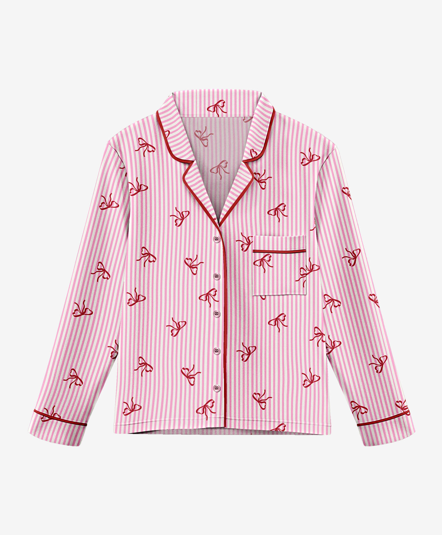 Dámské pyžamo se vzorem mašliček se skládá z kalhot a košile s límcem, zapínané na roztomilé růžové knoflíčky. Pyžamo je měkké na dotek a hřejivé, ideální na chladnější noci nebo večerní relax s knihou v ruce. Tato souprava je také skvělým nápadem na dárek.
