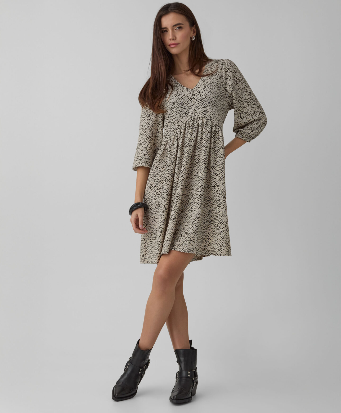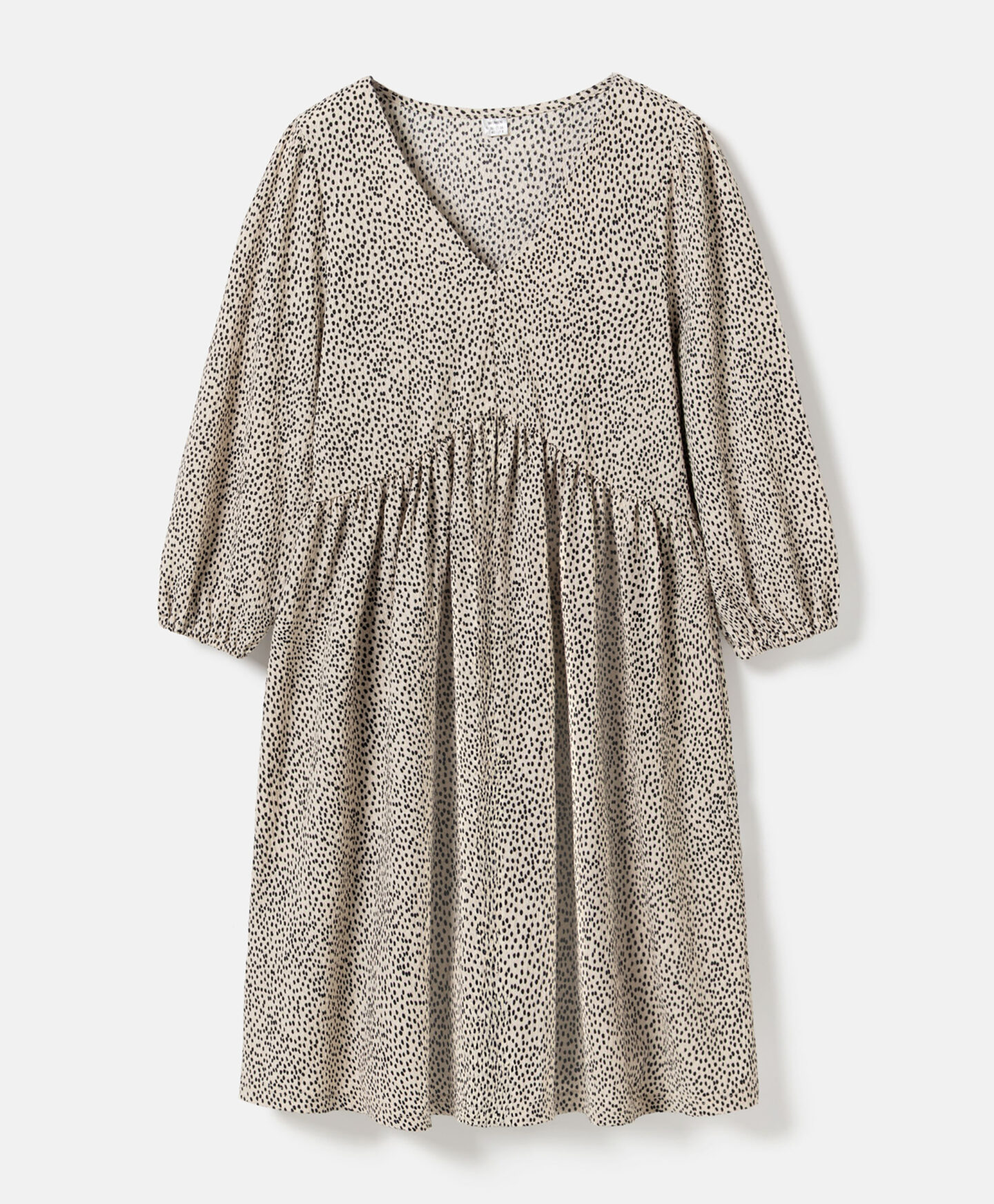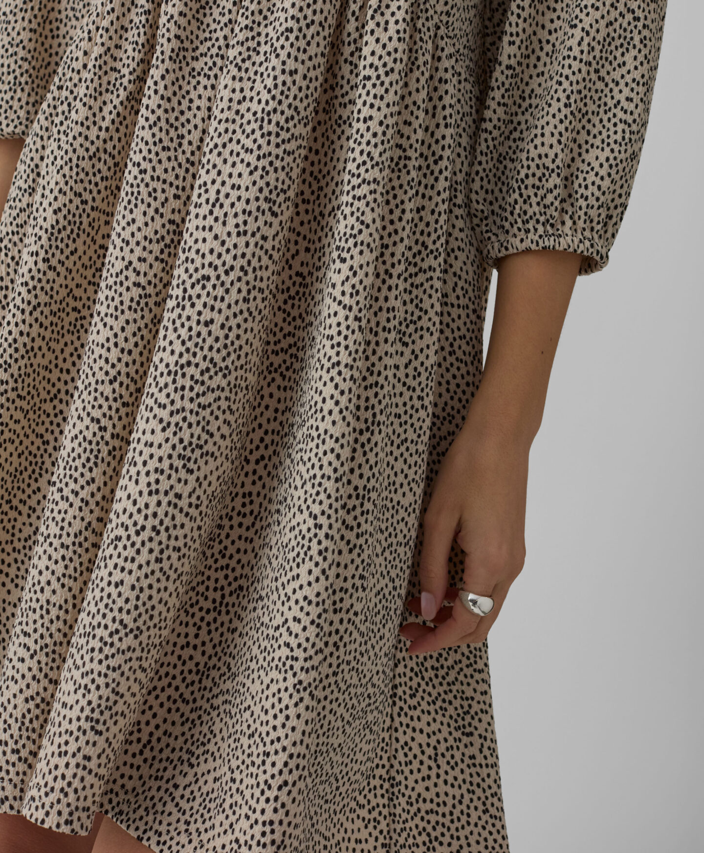 Dámské šaty s pokrčeným efektem vynikají nepravidelným vzorem. Charakteristické řasení vytváří trojrozměrný tvar, který tvaruje postavu. Jemný výstřih do V zdůrazňuje krk a dodává celému outfitu lehkost. Měkká tkanina zajišťuje pohodlné nošení během celého dne. Šaty můžete doplnit sportovní obuví i balerínkami nebo holínkami.