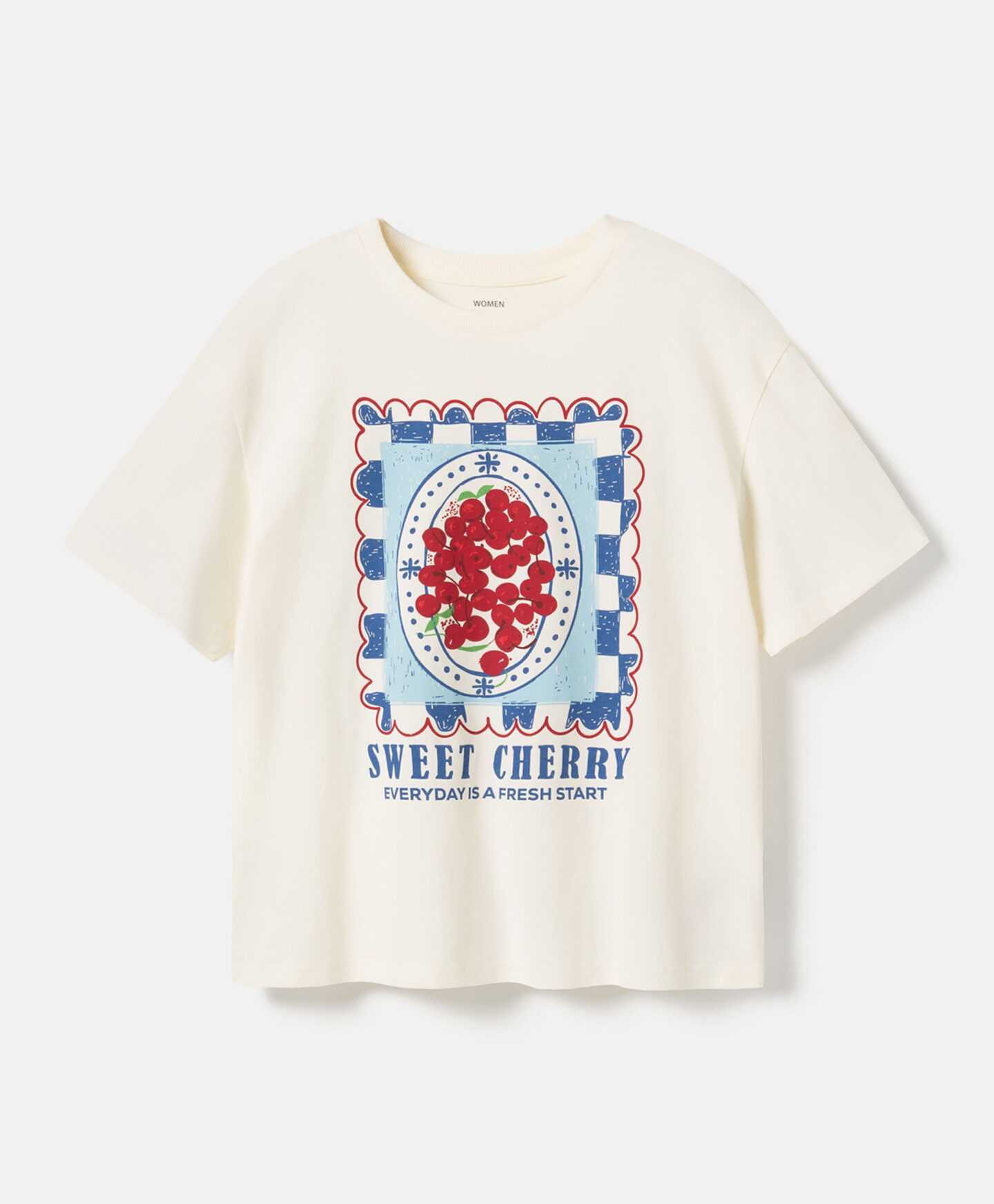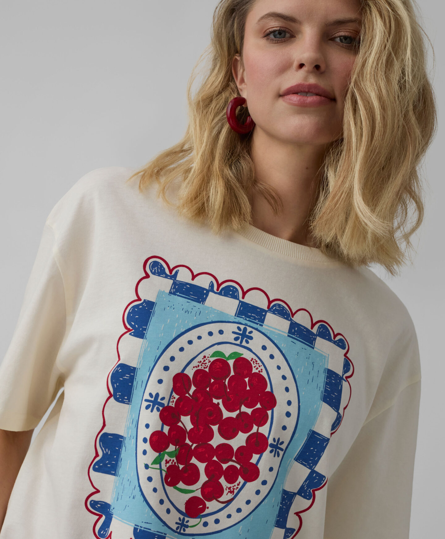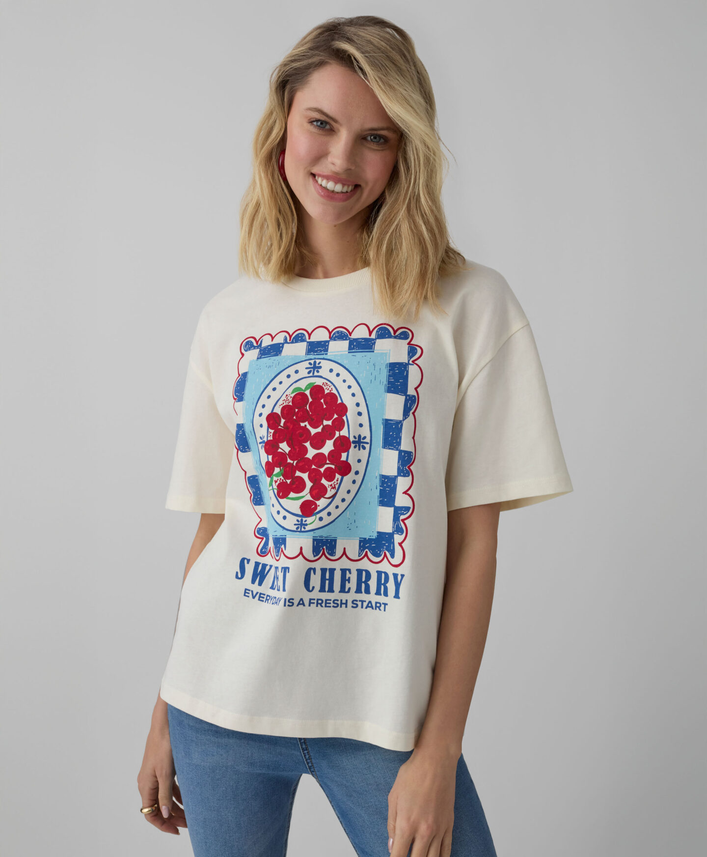 Dámské tričko ze 100% bavlny s potiskem třešní potěší milovnice pohodlí. Potisk na přední straně upoutá pozornost a odliší tričko od ostatních. V kombinaci s klasickými džínami vytváří univerzální outfit ideální na setkání s přáteli, každodenní nakupování nebo procházky se psem.