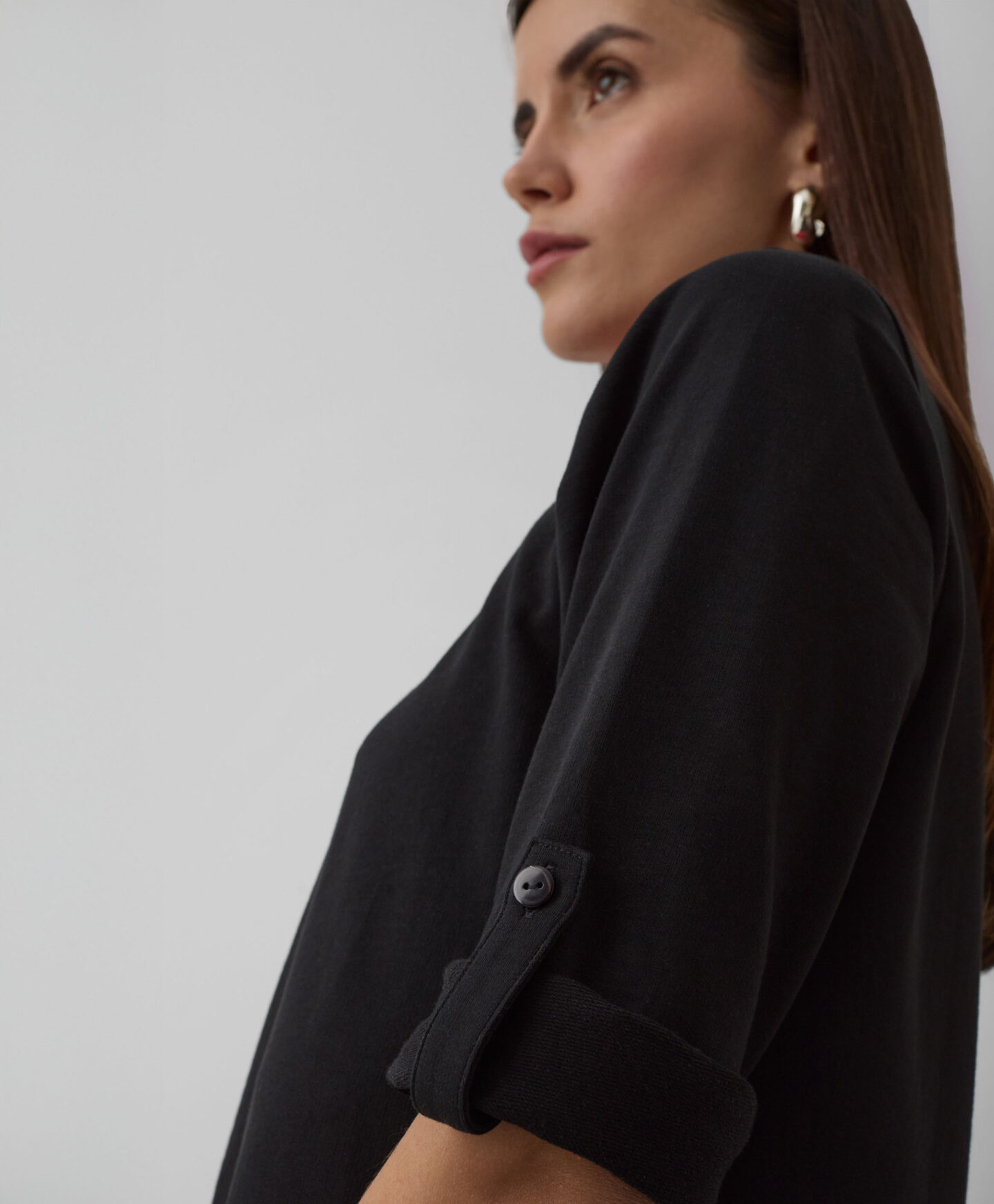 Dámské tričko se zaobleným lemem a ohrnutými rukávy je klasický kousek s inovativním nádechem. Univerzální černá barva a měkký materiál s vysokým podílem bavlny udělají z tohoto trička vaše oblíbené! Vypadá skvěle v kombinaci s džínami, sukní nebo elegantnějšími kalhotami. Hodí se na víkendovou procházku s vestou, do kanceláře pod sako a také v kombinaci s jemnou blůzkou během relaxace doma.