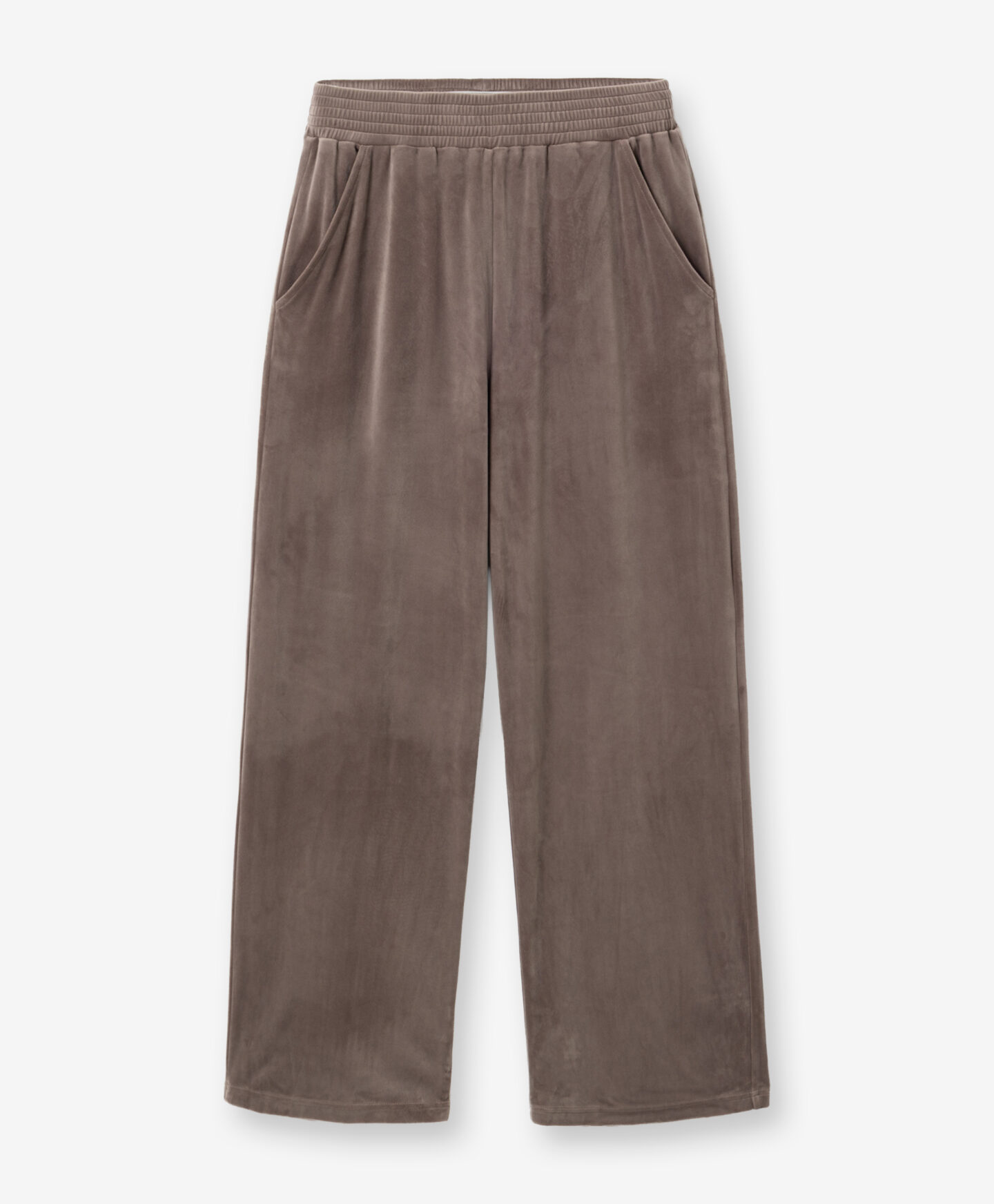 Dámské velurové hnědé tepláky spojují jednoduchost s elegancí. Široký střih kalhot nejen poskytuje úplnou svobodu pohybu, ale také opticky prodlužuje nohy a dodává outfitu nádech lehkosti. Měkký, elastický pas se perfektně přizpůsobí postavě.