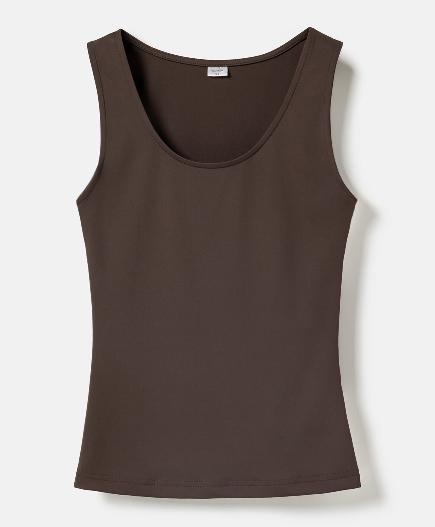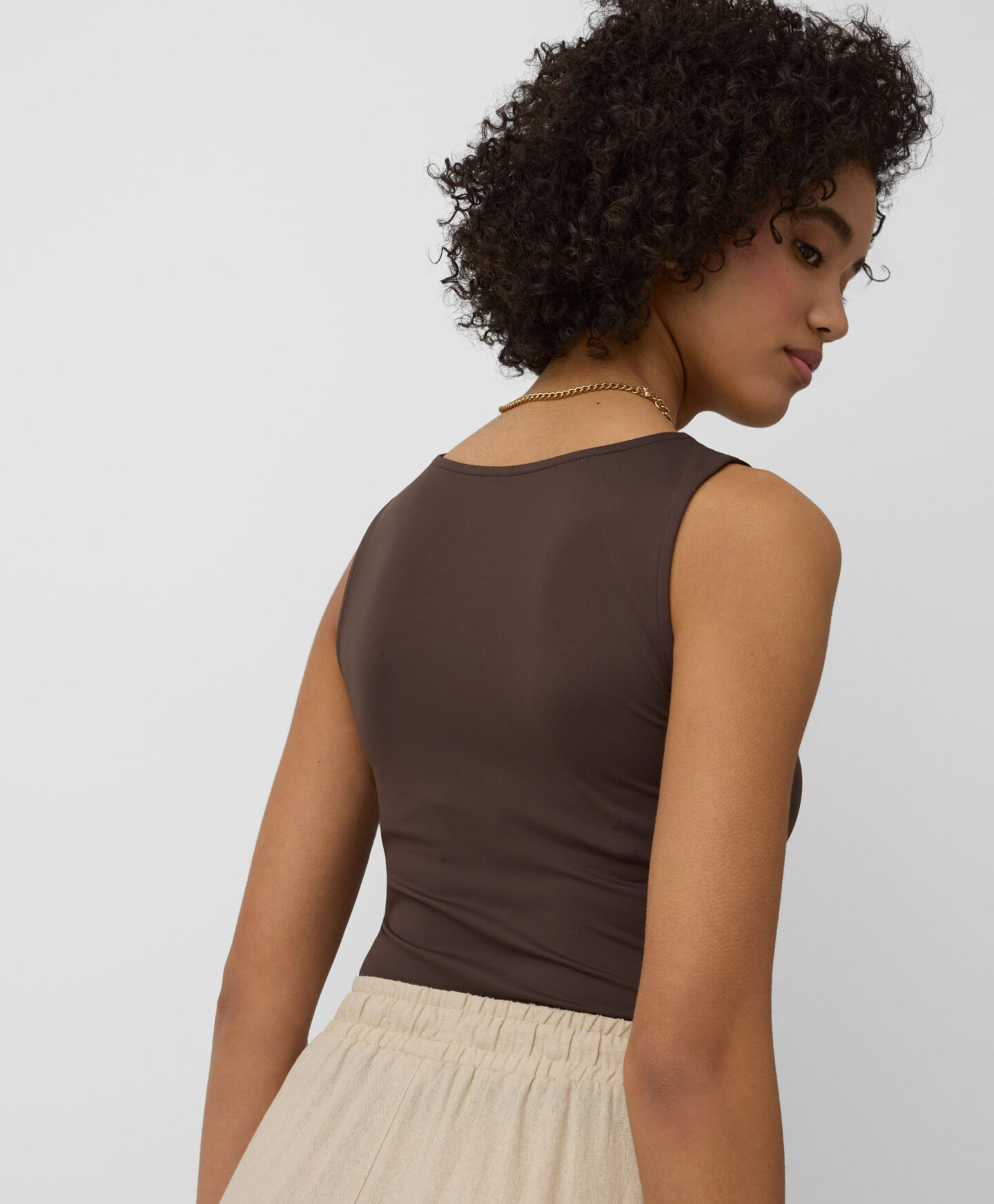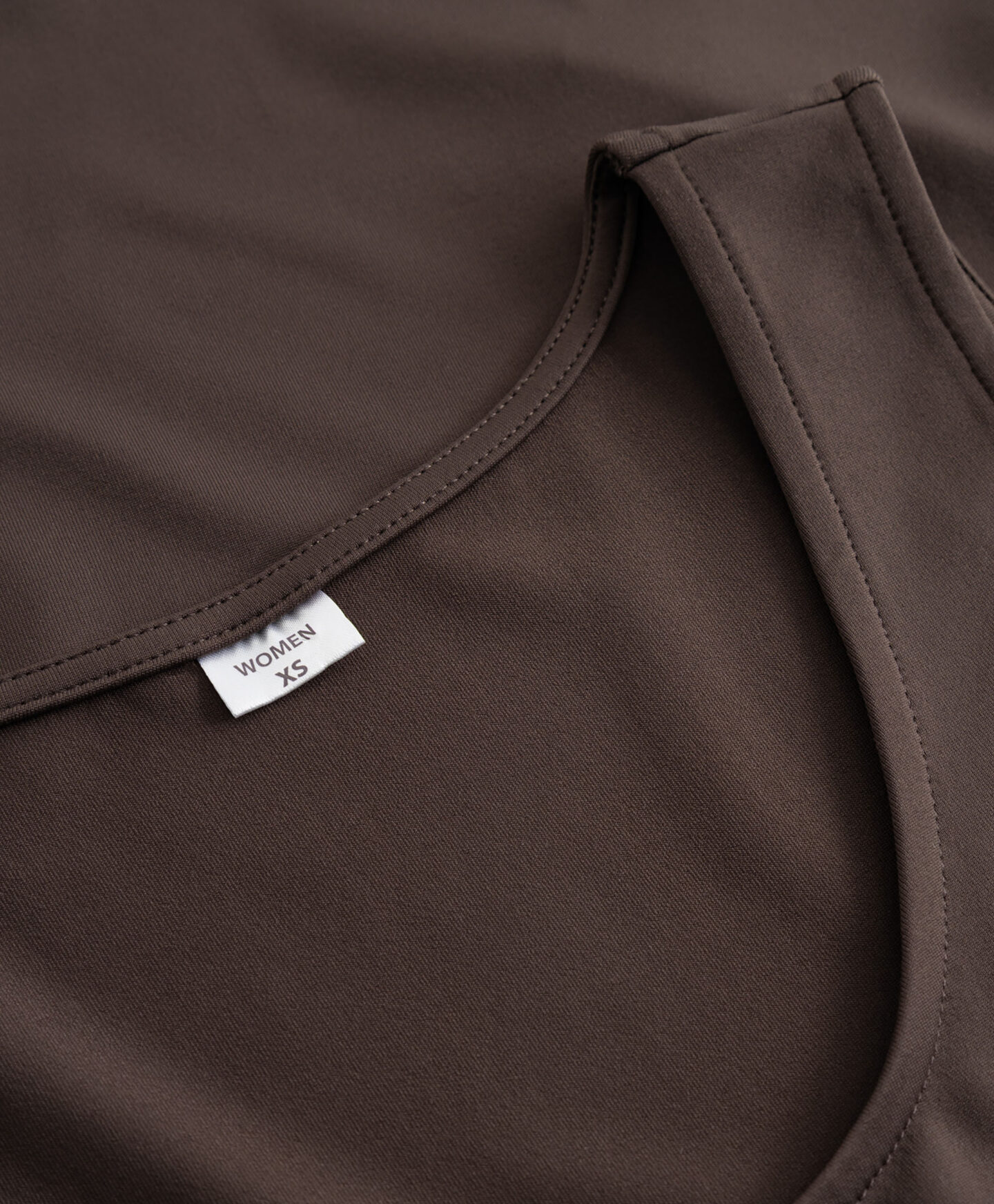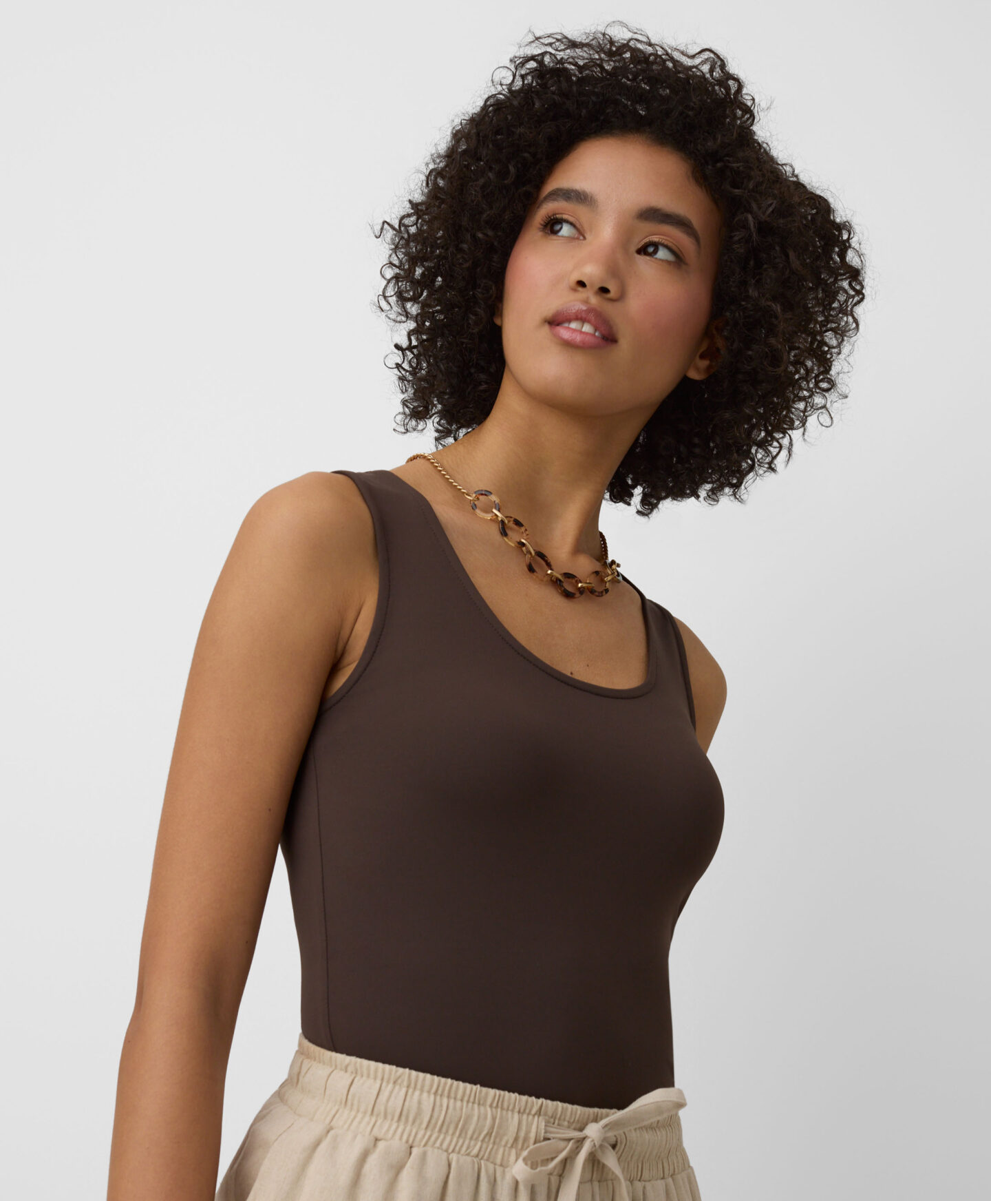 Tento dámský hnědý top je neuvěřitelně všestranný. Hodí se k džínám, chino kalhotám, šortkám i teplákům. Můžete jej nosit pod bundou nebo mikinou. Jemná textura a jednolitá barva dělají z tohoto topu neodmyslitelný kousek každého outfitu. Na výběr ve třech barevných variantách.