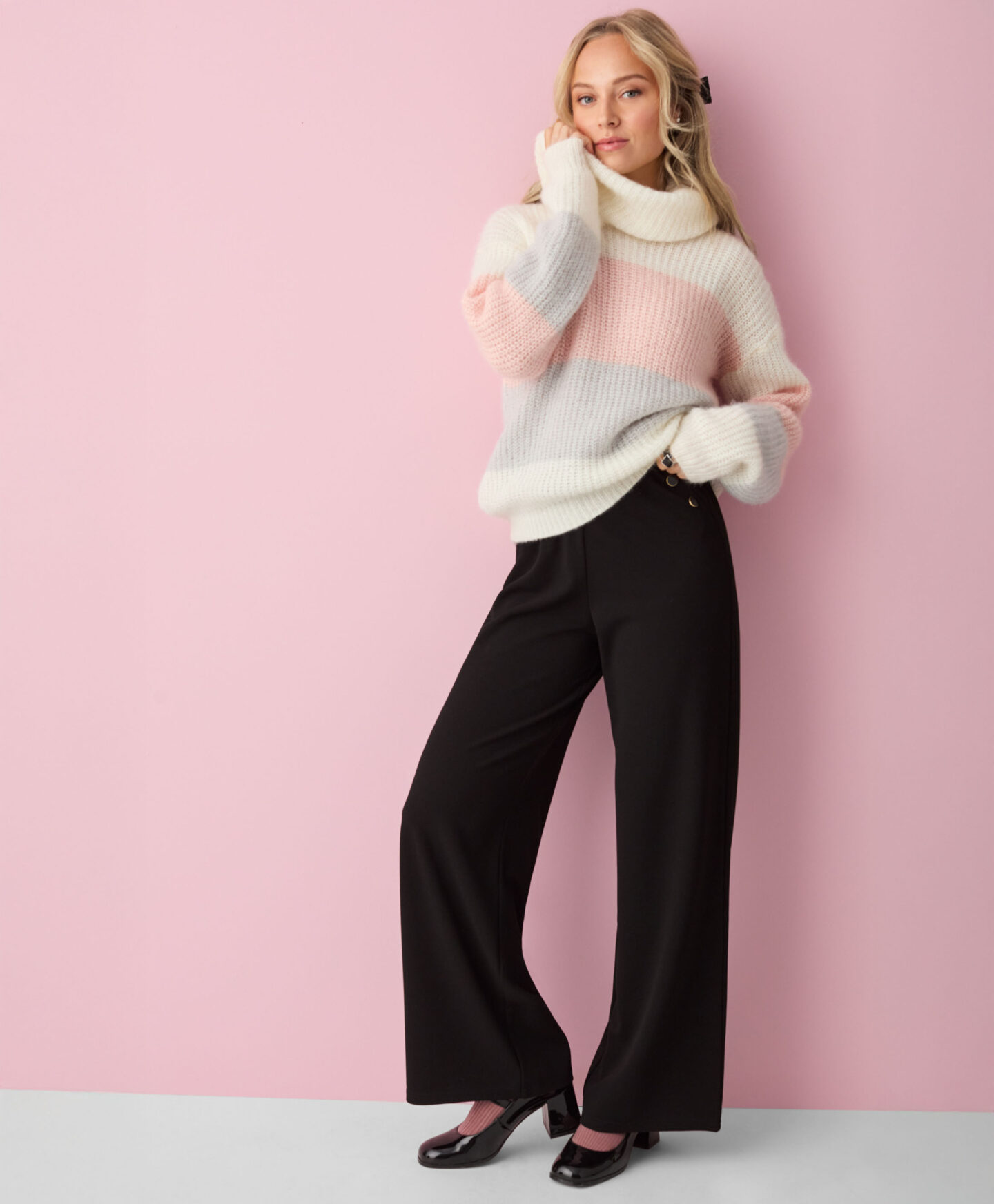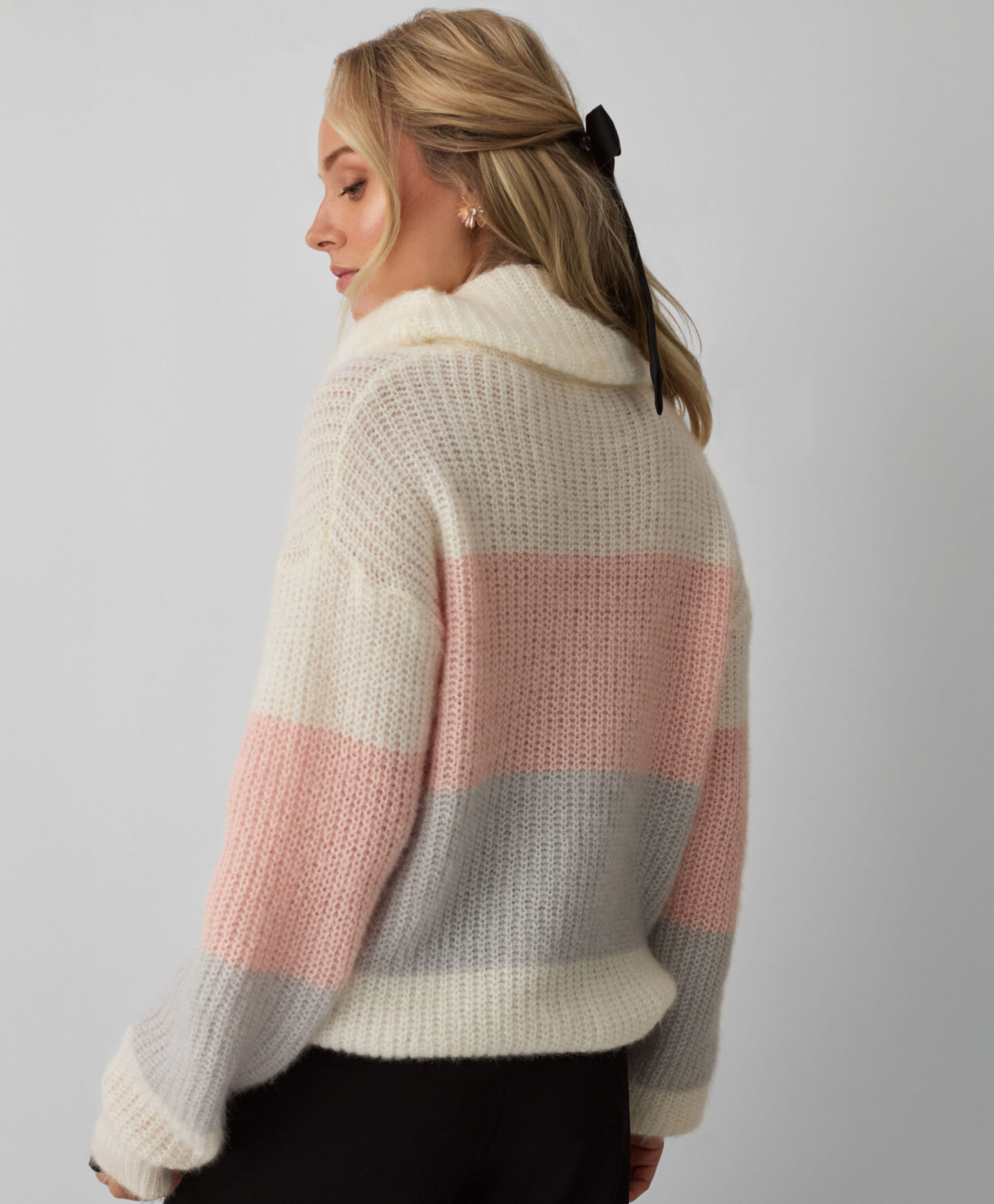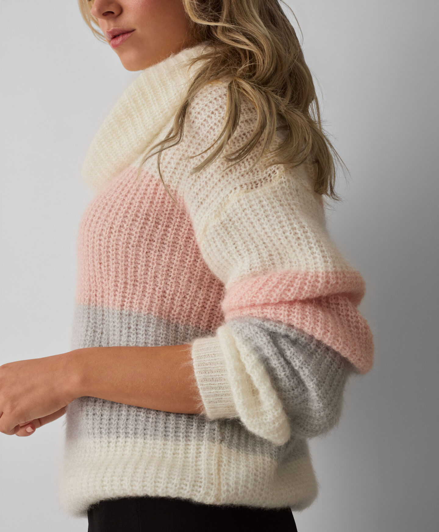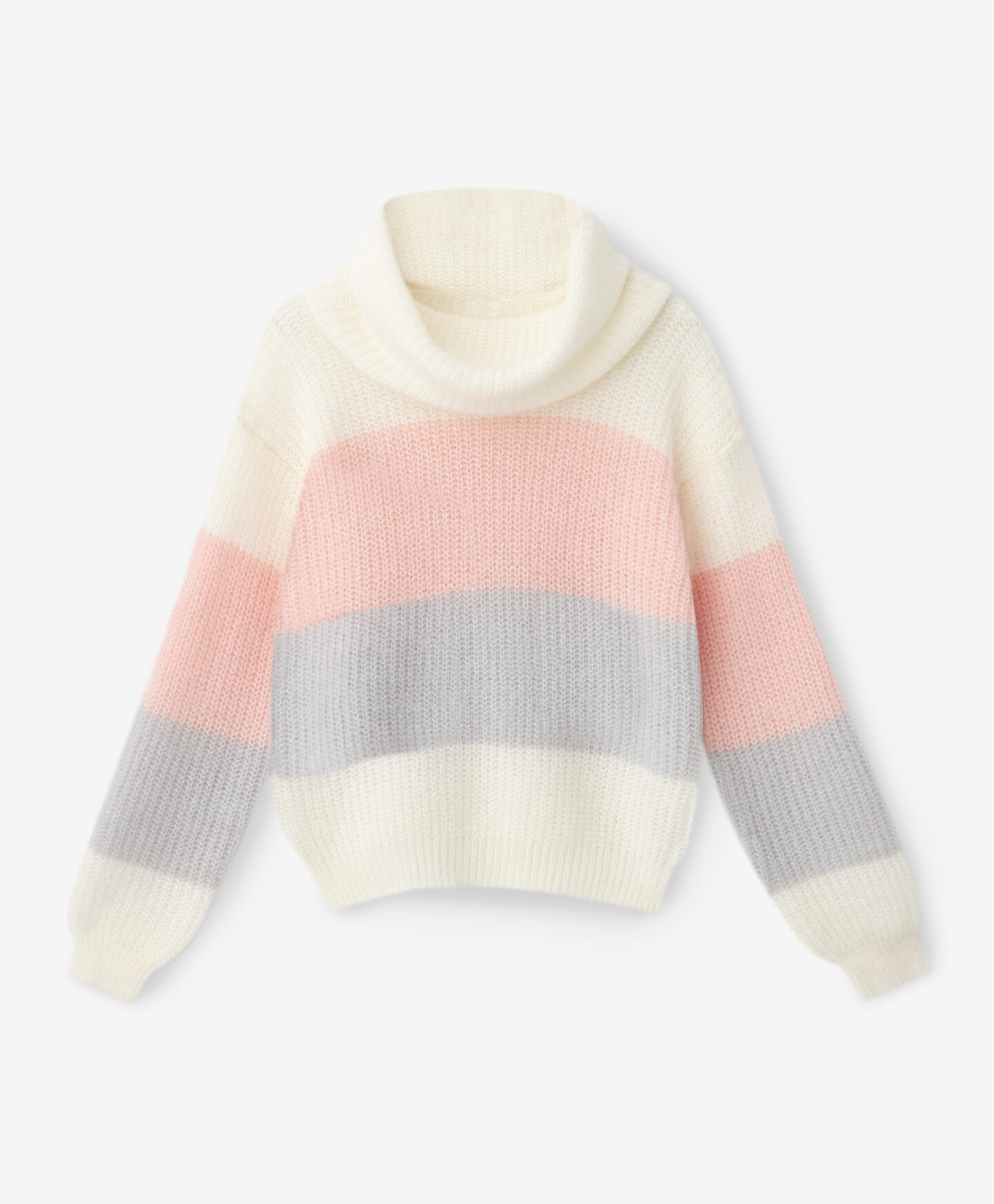 Dámský pruhovaný pulovr s rolákem vás zahřeje v chladných dnech. Pulovr je hřejivý, měkký na dotek a pohodlný na nošení. Široké pruhy v pastelových barvách dodávají jemnost. Bude vypadat skvěle v kombinaci s klasickými džínami, elegantními i sportovnějšími kalhotami.