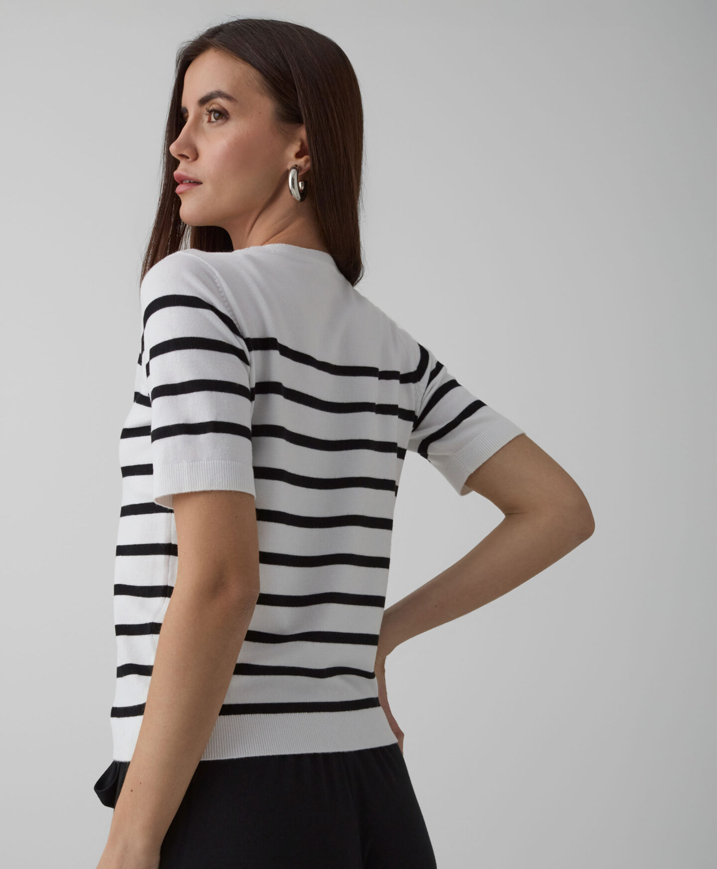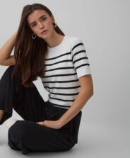 Dámský pruhovaný pulovr s krátkým rukávem je spolehlivou nezbytností šatníku. Perfektní volba v přechodném období. Klasický pruhovaný vzor se bude krásně hodit k většině oblečení ve vašem šatníku. Krátké rukávy nabízejí řadu možností stylizace – můžete jej nosit samostatně nebo v kombinaci s bundou. Univerzální střih se perfektně přizpůsobí různým typům postavy. Pulovr se snadno udržuje, zachovává si barvu a tvar i po mnoha vypráních.