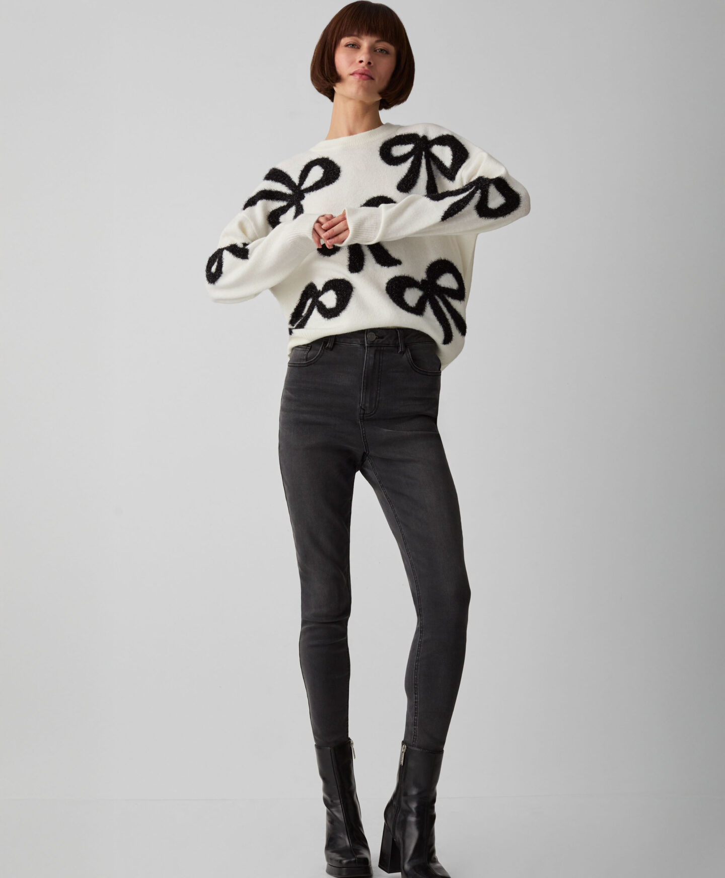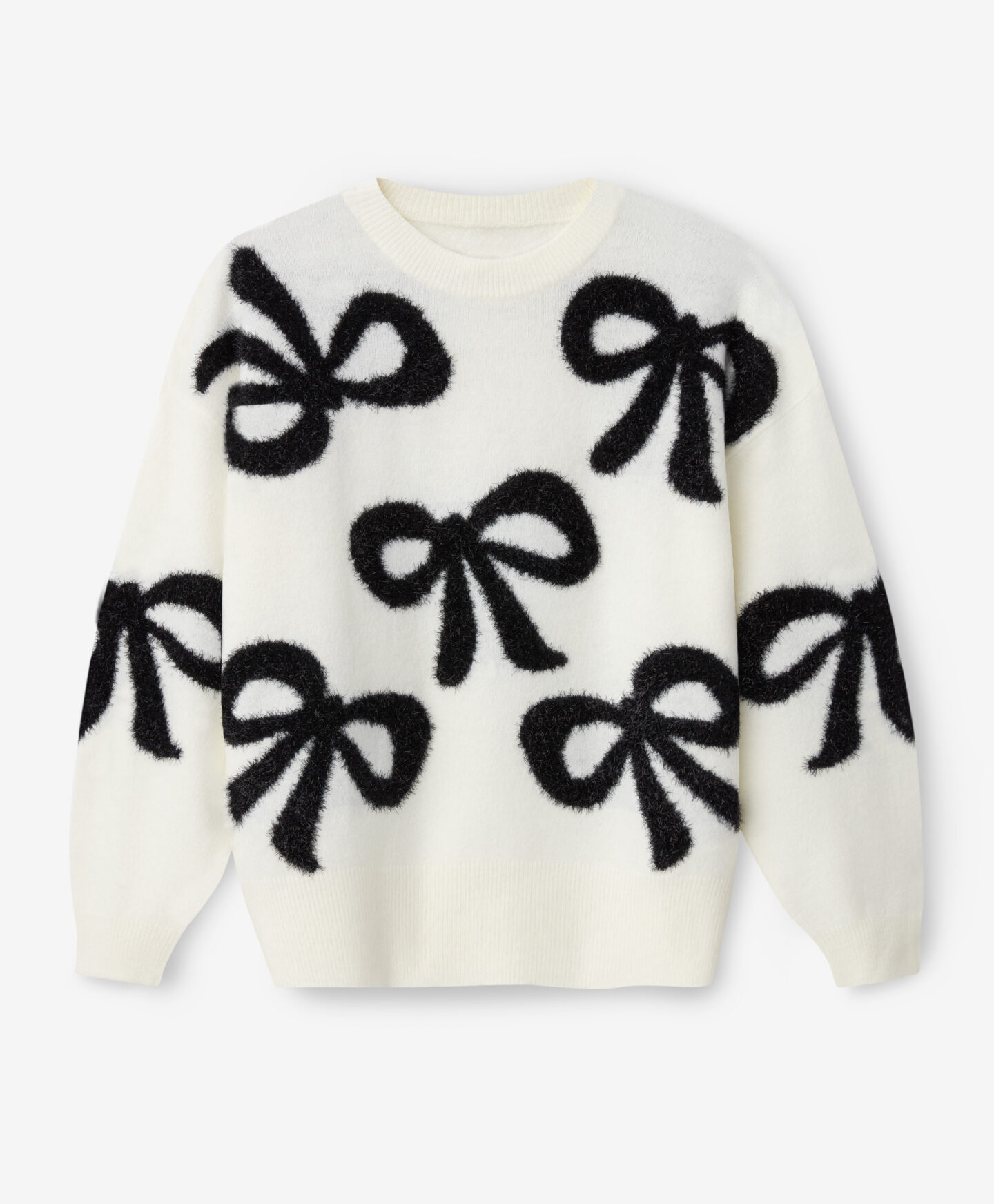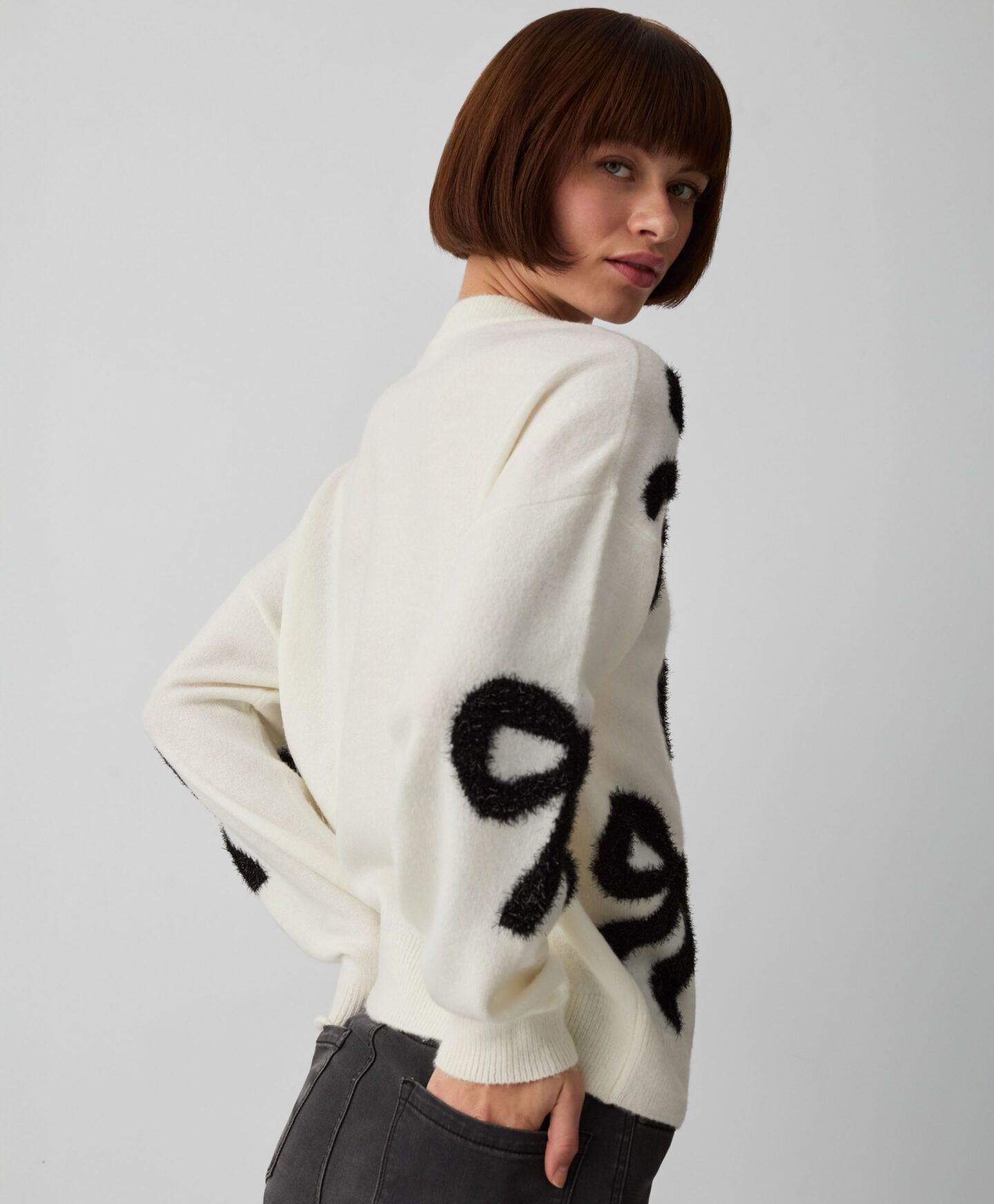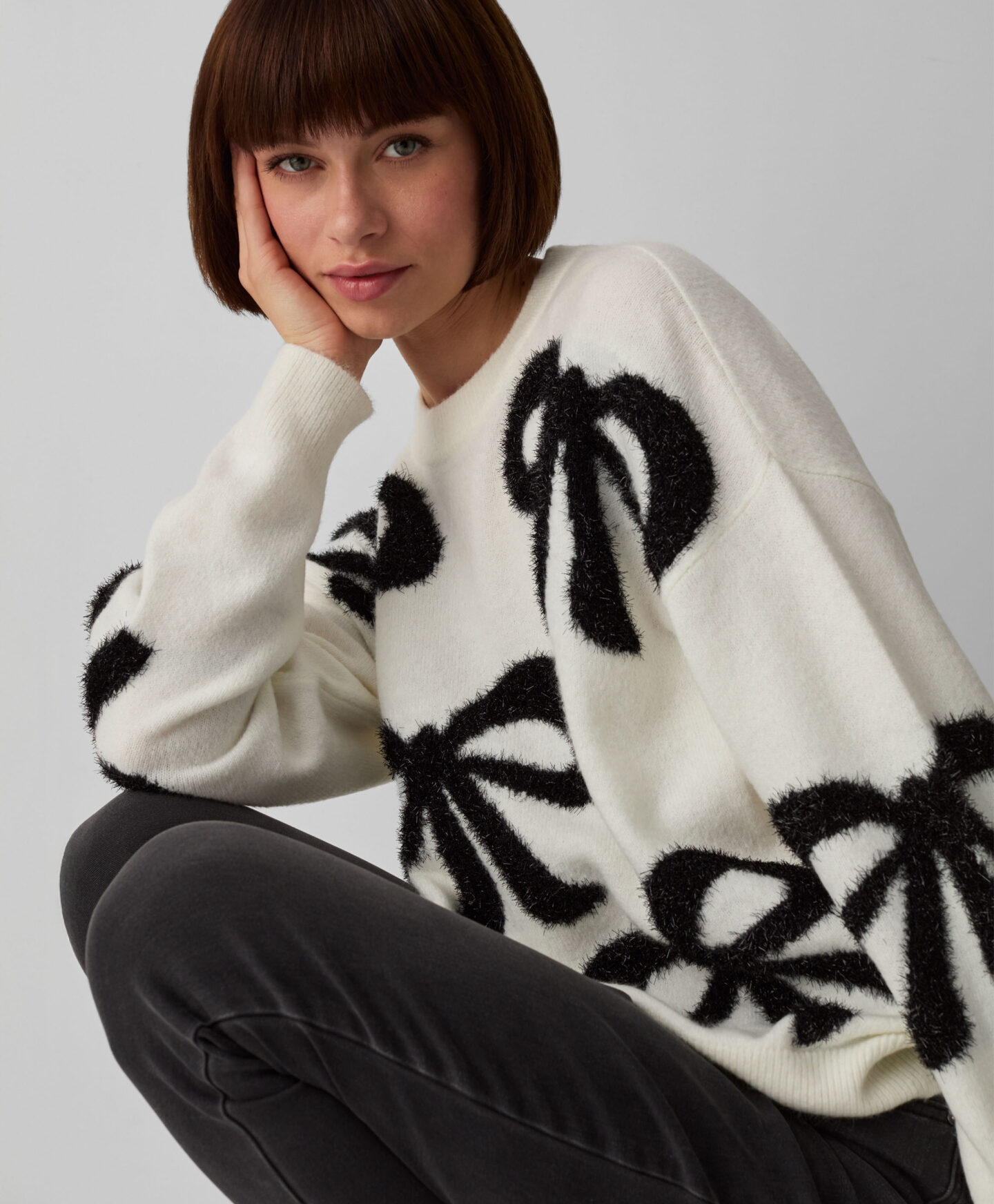 Dámský pulovr s mašlí a lurexem je určen pro ty, které rády září. Kombinace klasických barev jako bílá a černá dokonale doplní váš podzimní šatník a nabídne mnoho možností stylingu. Pulovr je hřejivý, měkký na dotek a krásně zvýrazňuje postavu.