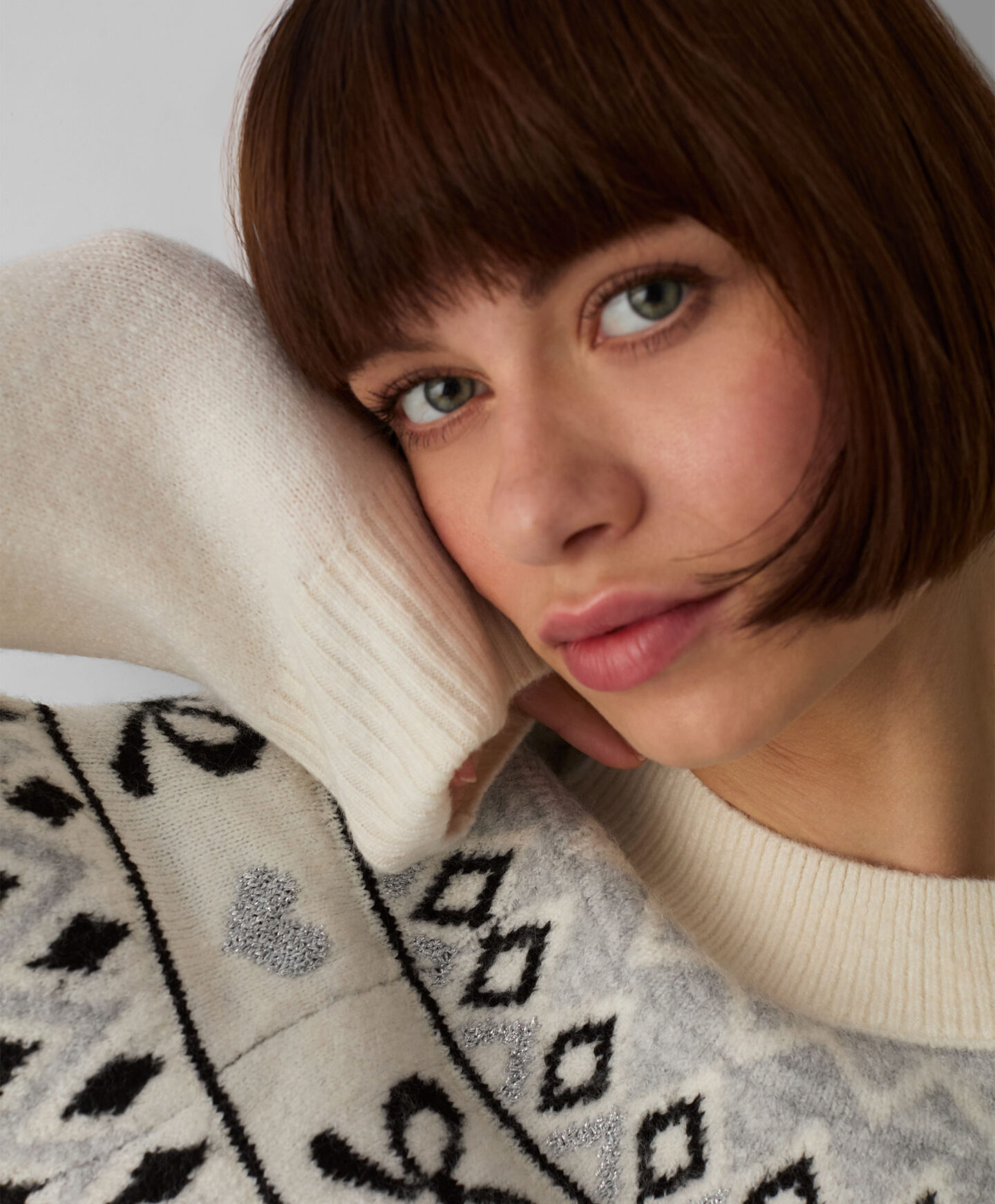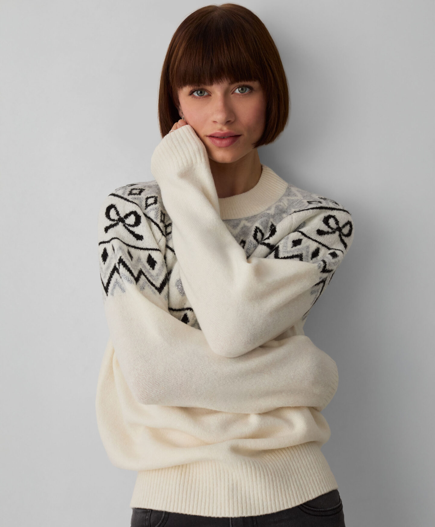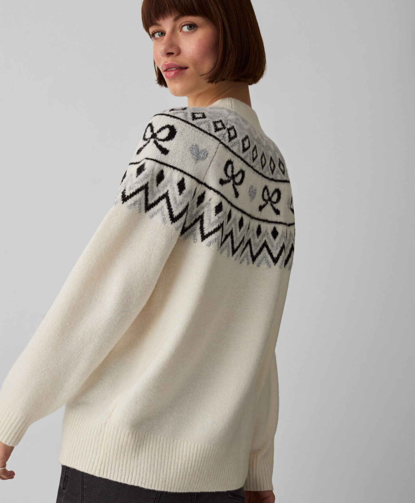 Dámský severský pulovr s mašličkami je nejen hřejivý, ale také stylový. Krémová barva prokládaná šedými a černými norskými vzory vypadá velmi působivě. Můžete jej zkombinovat se sukní nebo kalhotami, čímž zaručíte vždy úspěšný styling.