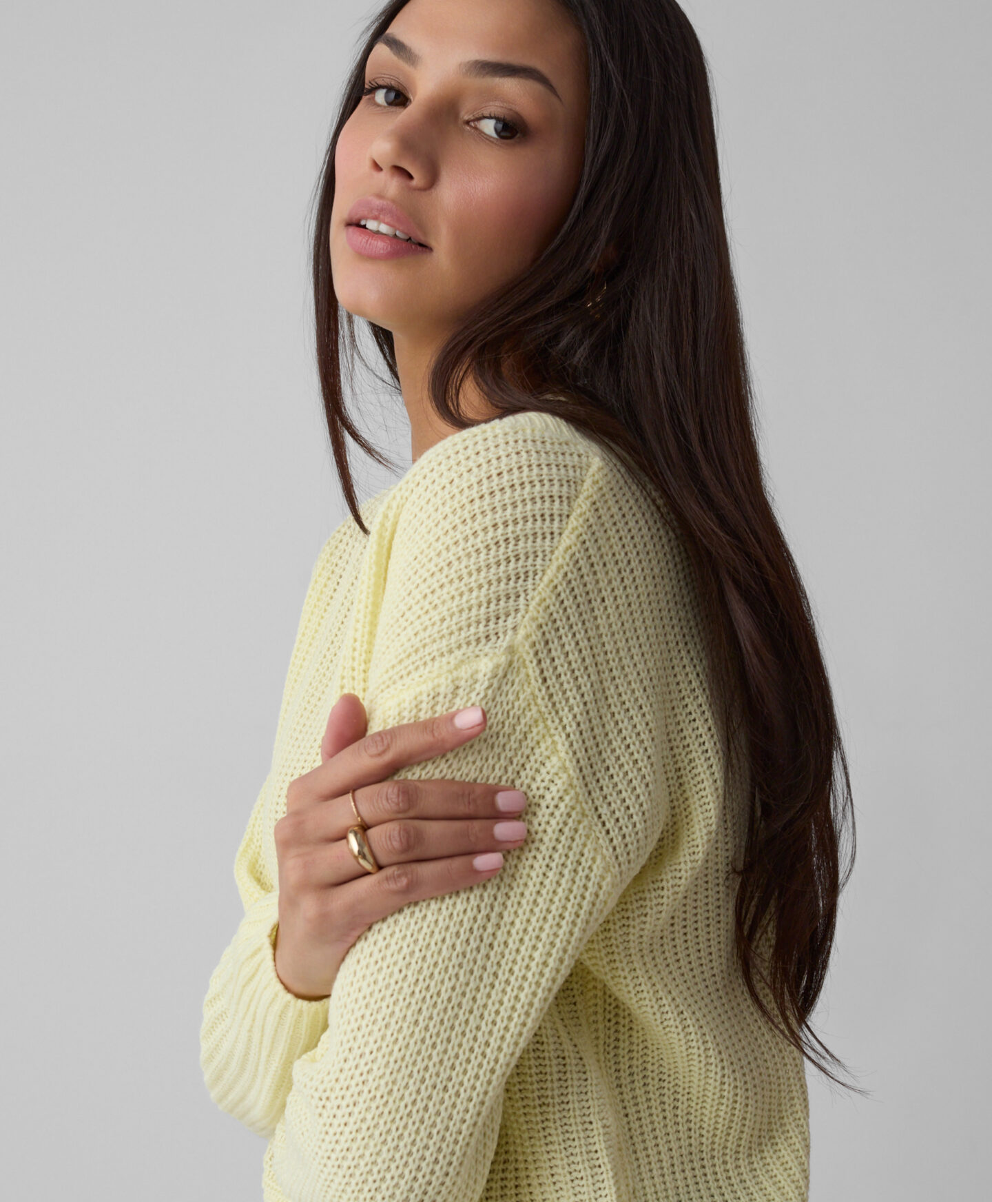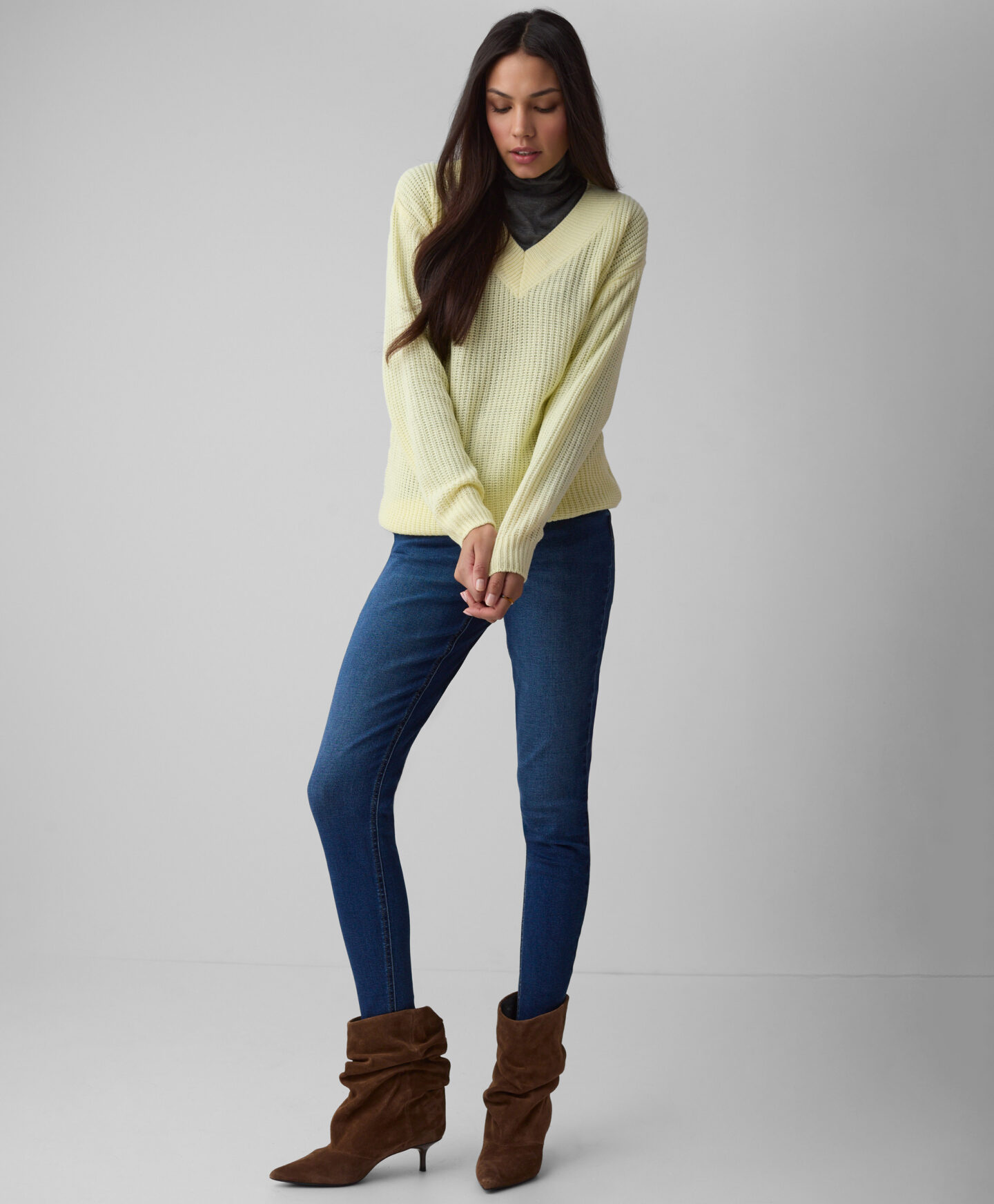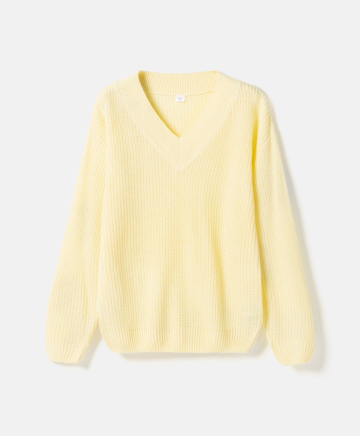 Dámský žlutý pulovr s výstřihem do V je ideální na každodenní nošení. Je to vynikající volba při nošení přes tričko nebo elegantní košili. Přední střih zvýrazňuje výstřih a zeštíhluje krk, zatímco úplet dodává outfitu styl. Pulovr je hřejivý, měkký a velmi ženský. V nabídce jsou na výběr dva vzory.