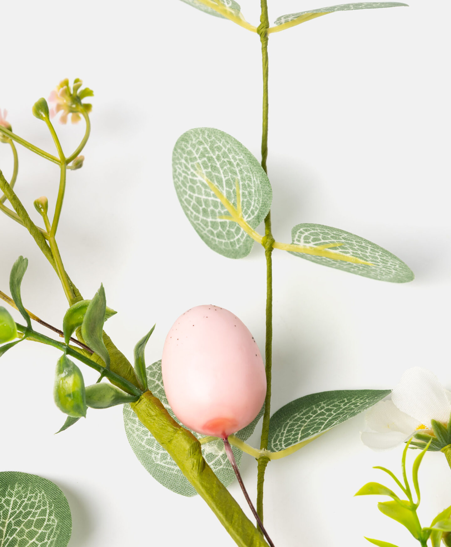 Tato 60 cm dlouhá dekorativní větvička s barevnými velikonočními vajíčky a květinami je perfektním řešením pro ty, kteří hledají hotovou a velkolepou dekoraci. Můžete ji použít k vytvoření větší ústřední dekorace nebo ji umístit do květináče, abyste svým domácím květinám dodali velikonoční nádech. Hodí se také jako součást kytice nebo samostatně ve váze. Vneste jaro do svého obývacího pokoje s touto ozdobnou větvičkou!