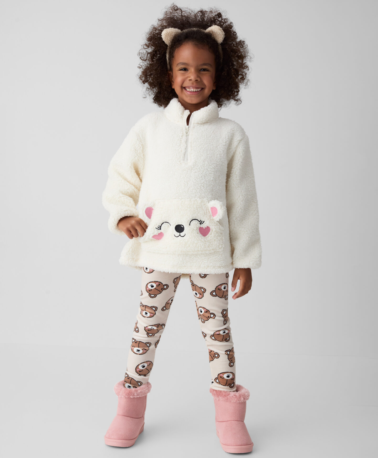 Dívčí bílá mikina sherpa je ideální pro malé milovnice pohodlí. Zapínání na krku usnadňuje dítěti samostatné oblékání a svlékání mikiny. Klokaní kapsa s roztomilým medvídkem a 3D prvky zahřeje studené ruce v chladných dnech. Volný střih zajišťuje pohodlí při nošení a příjemný materiál poskytuje teplo. Ideální na zimní večery doma nebo na venkovní aktivity.