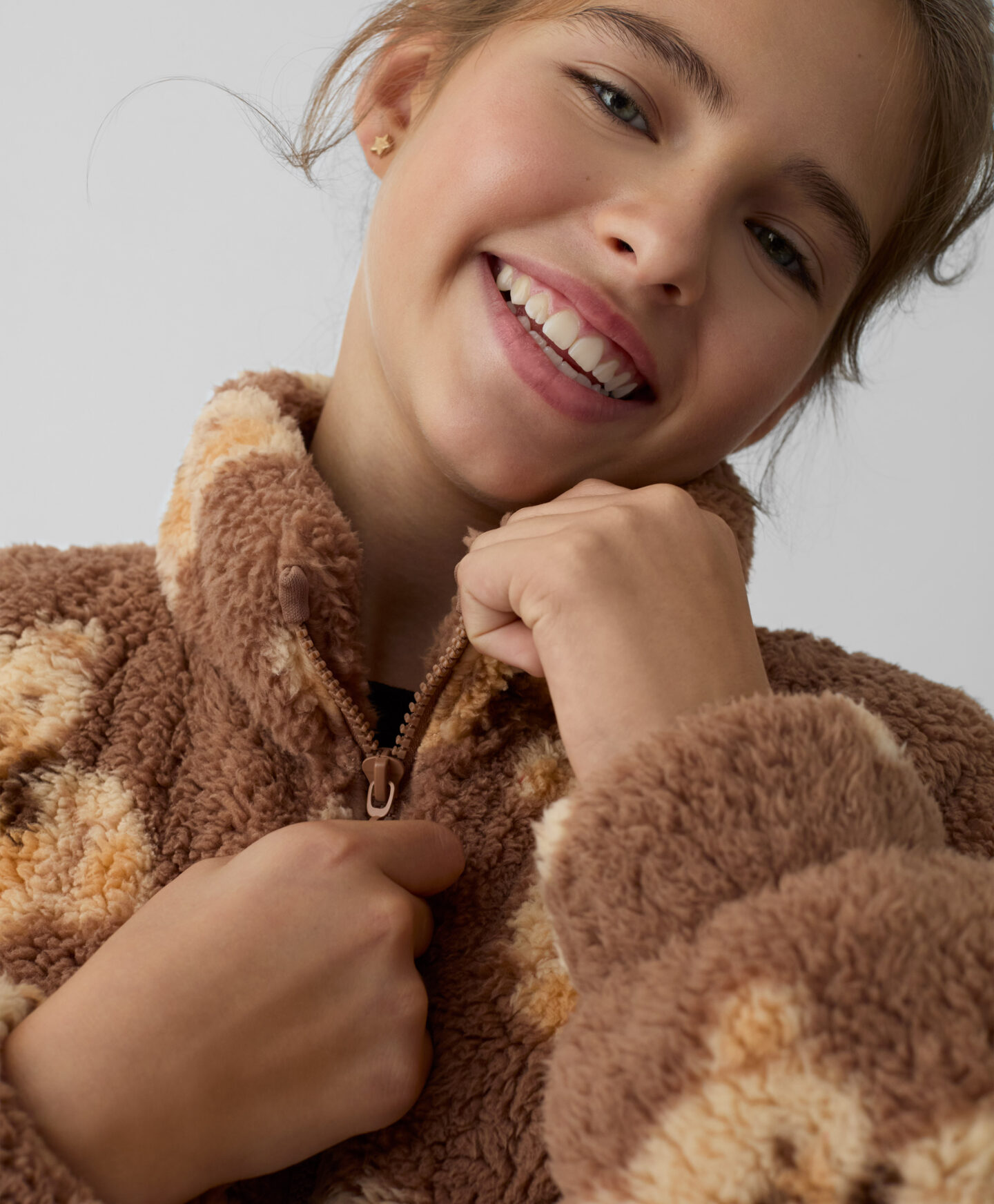 Dívčí mikina sherpa s medvídky se zapíná na pohodlný zip. Je kombinací stylu, tepla a pohodlí. Vyrobená z měkkého materiálu, jemně obepíná pokožku dítěte. Zip po celé délce zajišťuje rychlé oblékání a svlékání, zatímco volný střih umožňuje volný pohyb a poskytuje dítěti naprostou svobodu.