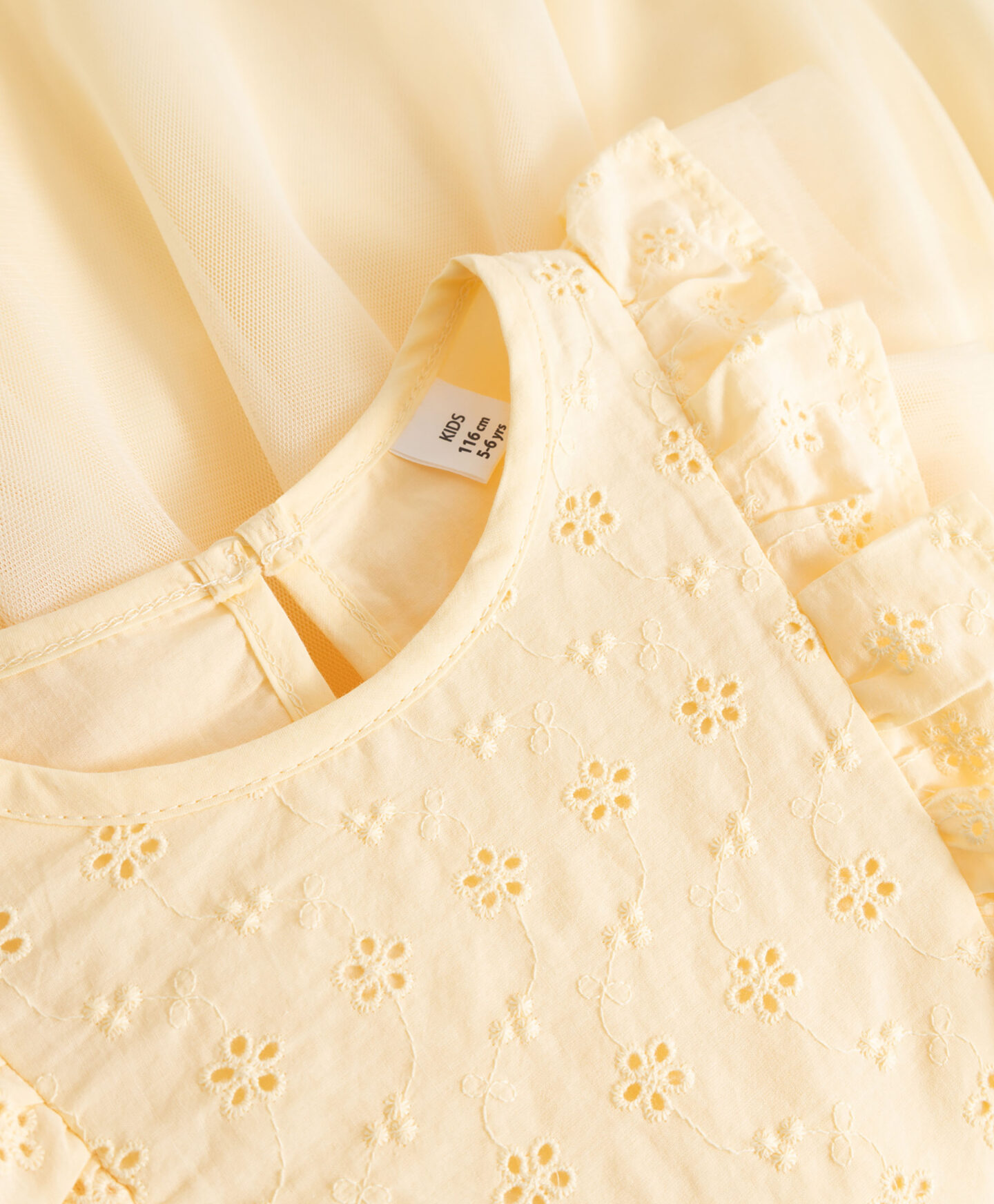 Tyto pastelově žluté šaty pro dívky rozzáří každou holčičku. Krásný živůtek, perforovaný jemnými květinovými detaily, dodává nádech stylové elegance. Tylové motýlí rukávy dodávají šatům lehký a vzdušný vzhled. Tylová sukně je ztělesněním lehkosti a jemnosti. Je to perfektní volba na slunečný a teplý den.