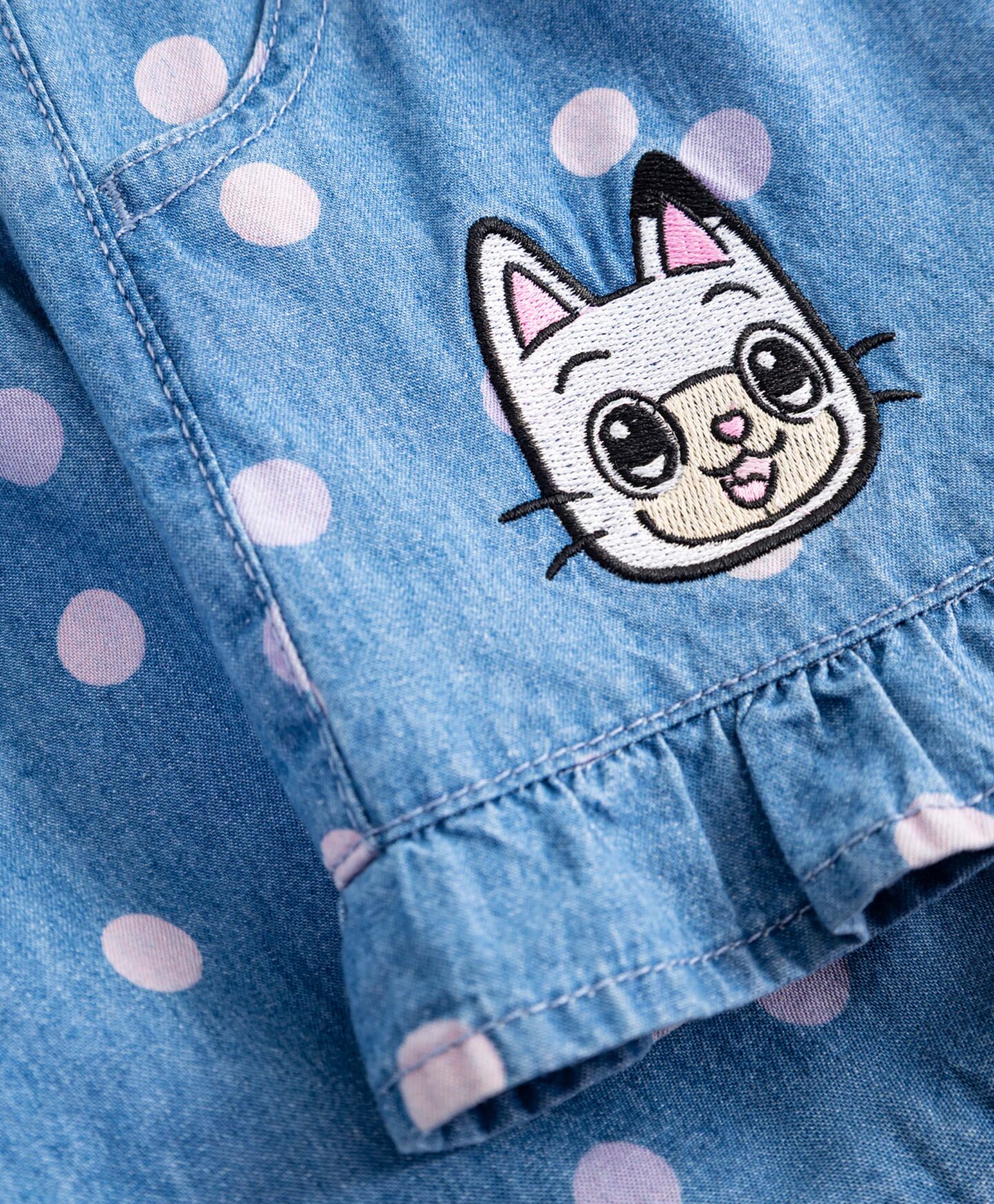Dívčí šortky Gabby’s Dollhouse ze 100% bavlny s volánky na nohavicích mají pohodlné kapsy a elastický pas. Puntíkovaný vzor jim dodává šarm a grafika s vaší oblíbenou kreslenou postavičkou je odlišuje od ostatních kousků šatníku. Ideální do školky, na hřiště nebo na rodinné procházky.