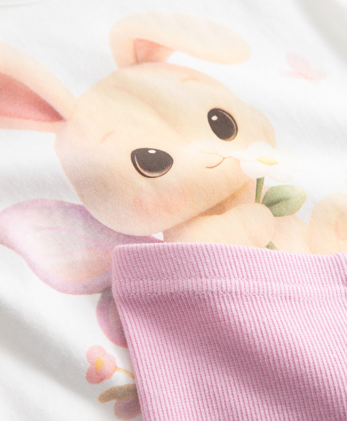 Dívčí sada se skládá z trička a elastických šortek. Tričko je vyrobeno z měkkého bavlněného materiálu, který je příjemný pro citlivou pokožku, a grafika zajíčka na přední straně si získá srdce každého malého milovníka těchto rozkošných stvoření. Legíny s vysokým podílem bavlny jsou elastické, takže neomezují pohyb a hru.