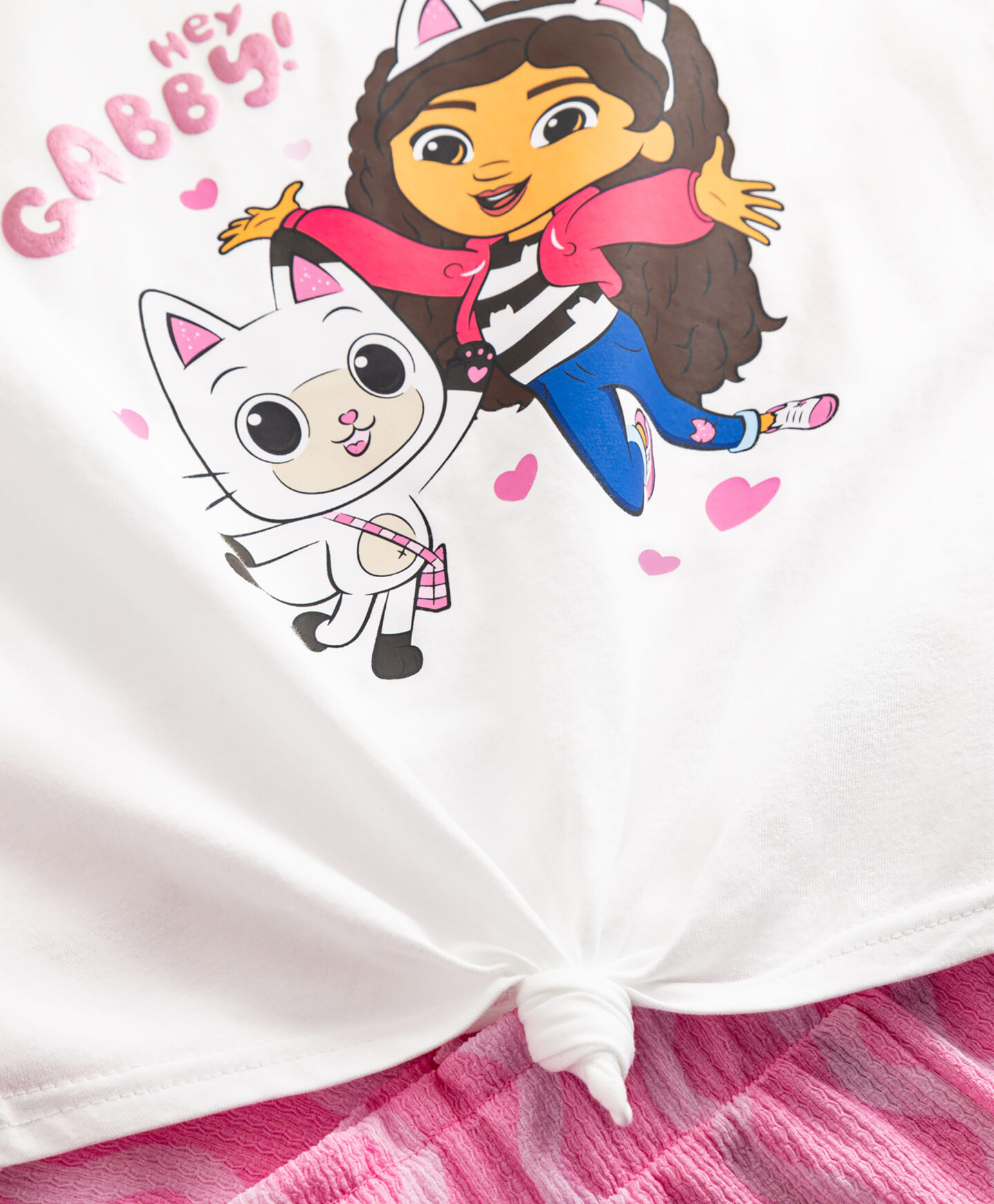 Dívčí souprava Gabby’s Dollhouse je módní návrh, který osloví mladé milovnice stylu. Tričko s vázáním a grafikou s oblíbenými postavičkami upoutá pozornost. Toto je skvělý nápad na styling pro mateřskou školu, hřiště nebo rodinné procházky za krásných slunečných dní.