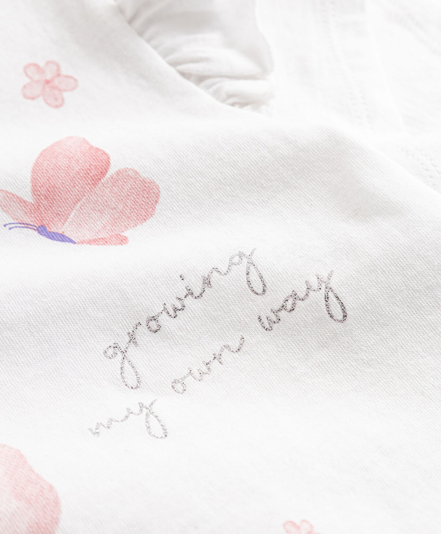 Toto 100% bavlněné tričko s motýlky je ideální pro fanoušky tohoto jemného hmyzu. 100% bavlna zajišťuje pohodlí a vysokou prodyšnost. Krátké rukávy jsou ideální na teplejší dny. Okouzlující volánek na rukávech dodává jemný dívčí nádech. Ideálně se hodí ke splývavým sukním a kalhotám.