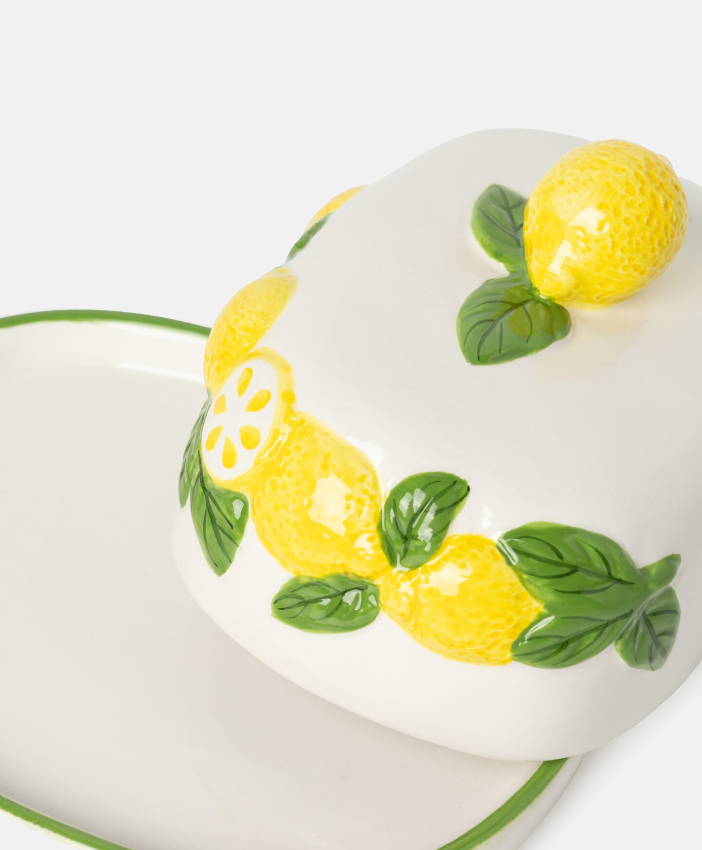 Tato dolomitová máslenka s 3D vzorem citrónů vnese léto do vaší kuchyně! Máslenka má víčko, které chrání máslo a zároveň zachovává jeho čerstvost a chuť. Ideální pro každodenní použití v kuchyni. Dolomit je odolný vůči poškrábání a zaručuje dlouhodobé používání, aniž by to ohrozilo jeho krásný vzhled.