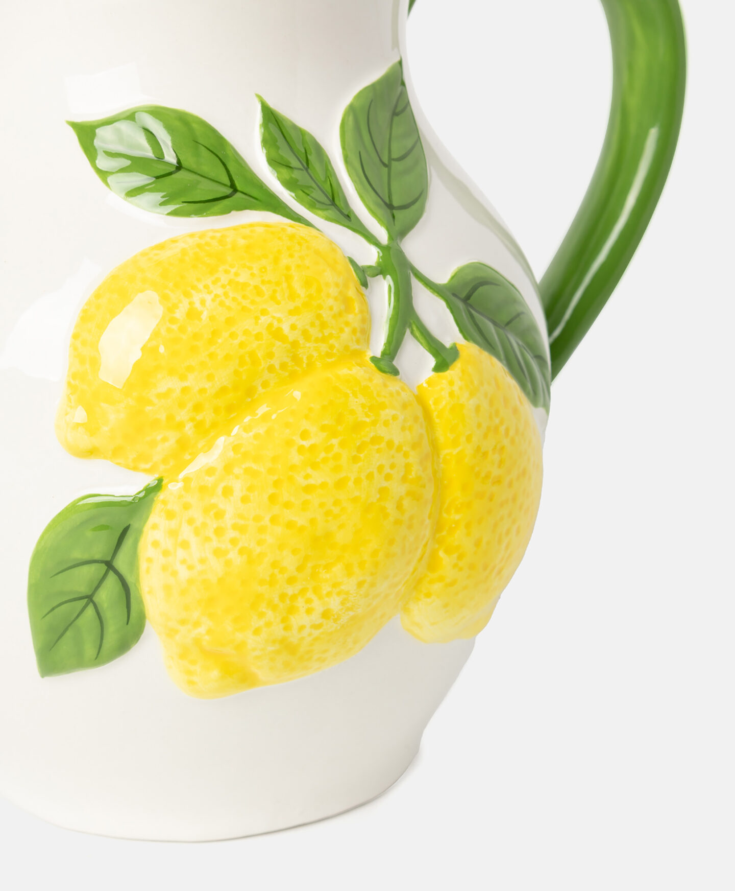 Tento džbán, zdobený 3D vzorem citrónů, má objem 1,8 litru. Je ideální pro každodenní jídla i pro větší setkání. Letní barvy dodají společným chvílím u stolu nádech lehkosti a bezstarostnosti. Ideální pro servírování limonády, mátové vody nebo jiných oblíbených nápojů.