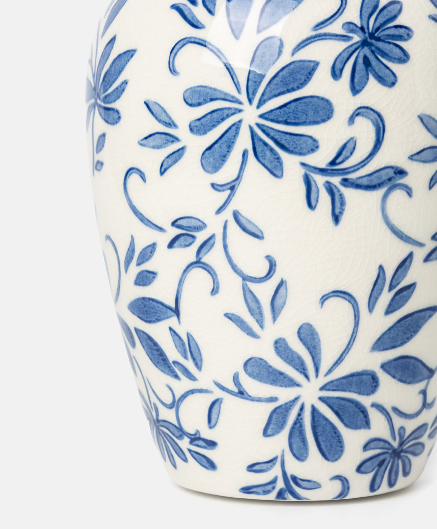 Tato vzorovaná kameninová váza je ideální pro vystavení čerstvých řezaných květin i umělých větví. Vypadá krásně i samostatně nebo jako součást dekorativní výzdoby. Váza je odolná, snadno se čistí a je zdobena krásným květinovým vzorem.
