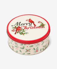 Kulatá červená plechová dóza je klasika ve vánočním vydání. Ozdobená půvabným nápisem a zimními motivy činí uskladnění sladkostí nebo ořechů mimořádně půvabným. Její nadčasový design znamená, že krásně doplňuje tradiční i moderní aranžmá.