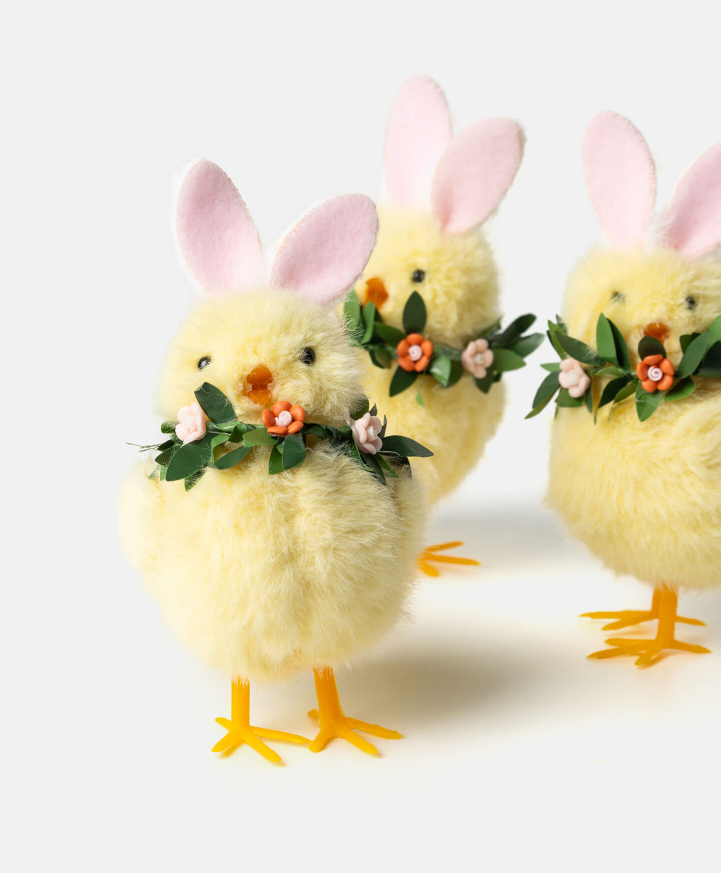 Kuřátka 3 ks jsou skvělé jako jarní dekorační prvek, krásný doplněk na poličku nebo dekorace do velikonočního košíku. Zaječí uši dodávají dekoraci nádech humoru a vykouzlí úsměv na tváři každému!