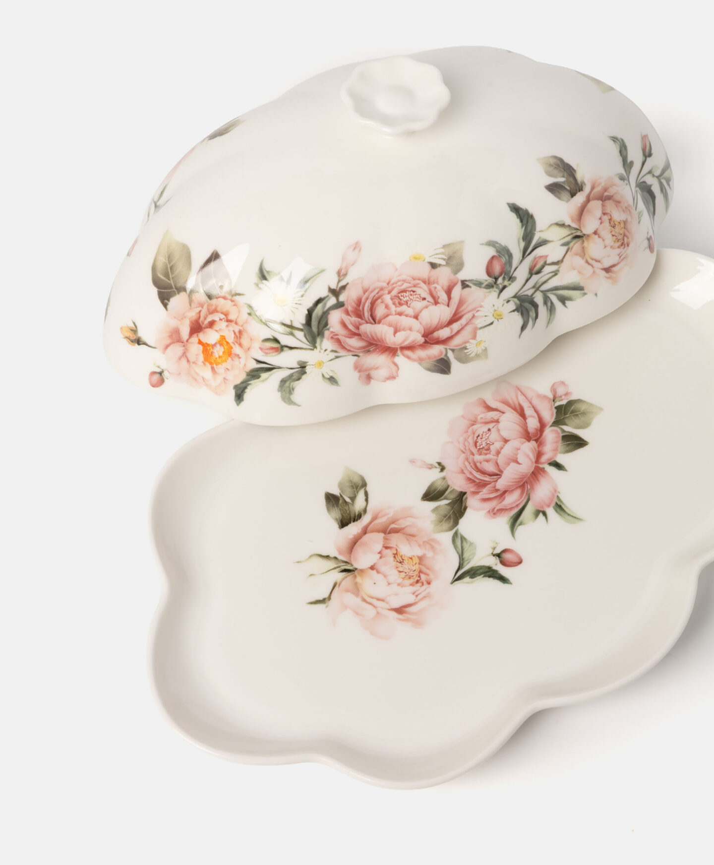 Máslenka s květinovým vzorem dokonale doplňuje nádobí z nejnovější kolekce. Je vyrobená z porcelánu New Bone China a zachovává si krémově bílý efekt a jemný lesk. Vzor kvetoucích pivoněk vnese jaro na váš stůl! ideální na každodenní používání, ale i na speciální příležitosti.