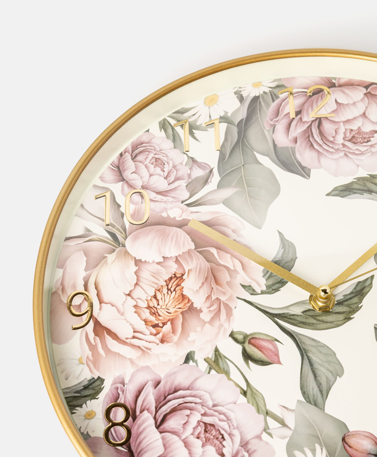 Nástěnné hodiny s květinovým vzorem odměřují čas a zároveň zkrášlují váš interiér. Motiv kvetoucí pivoňky ohlašuje jaro a dodává barvu každému aranžmá. Zlatý rám a ručičky vypadají neuvěřitelně stylově. Takové hodiny jsou vynikajícím dárkem pro milovníky jedinečných doplňků.