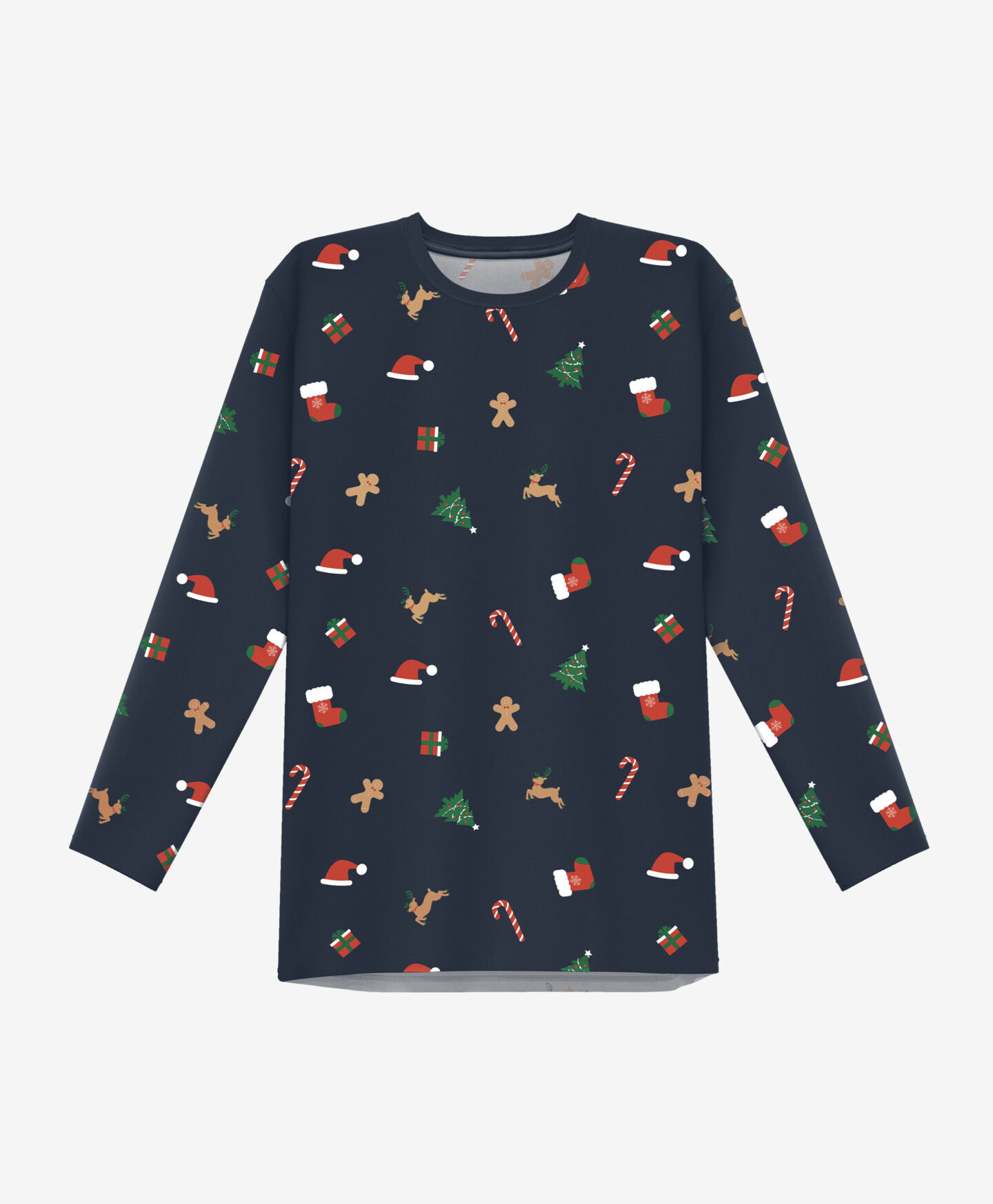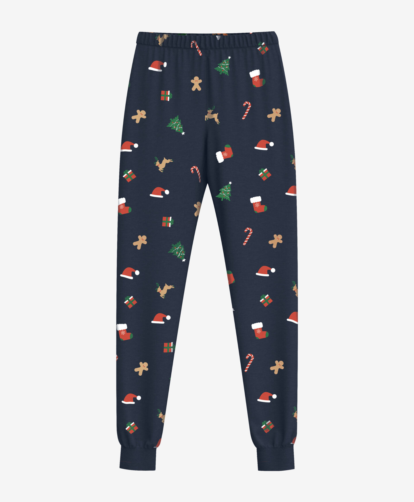 Tato pánská pyžamová souprava s vánoční tématikou se skládá z trička s dlouhým rukávem a kalhot. Tmavě modrá barva je zvýrazněna vánočním vzorem dárků, vánočních stromků, perníků a cukrových hůlek. Je to perfektní vánoční nebo mikulášský dárek pro milovníky sladkých pochoutek. V nabídce jsou i chlapecká pyžama.
