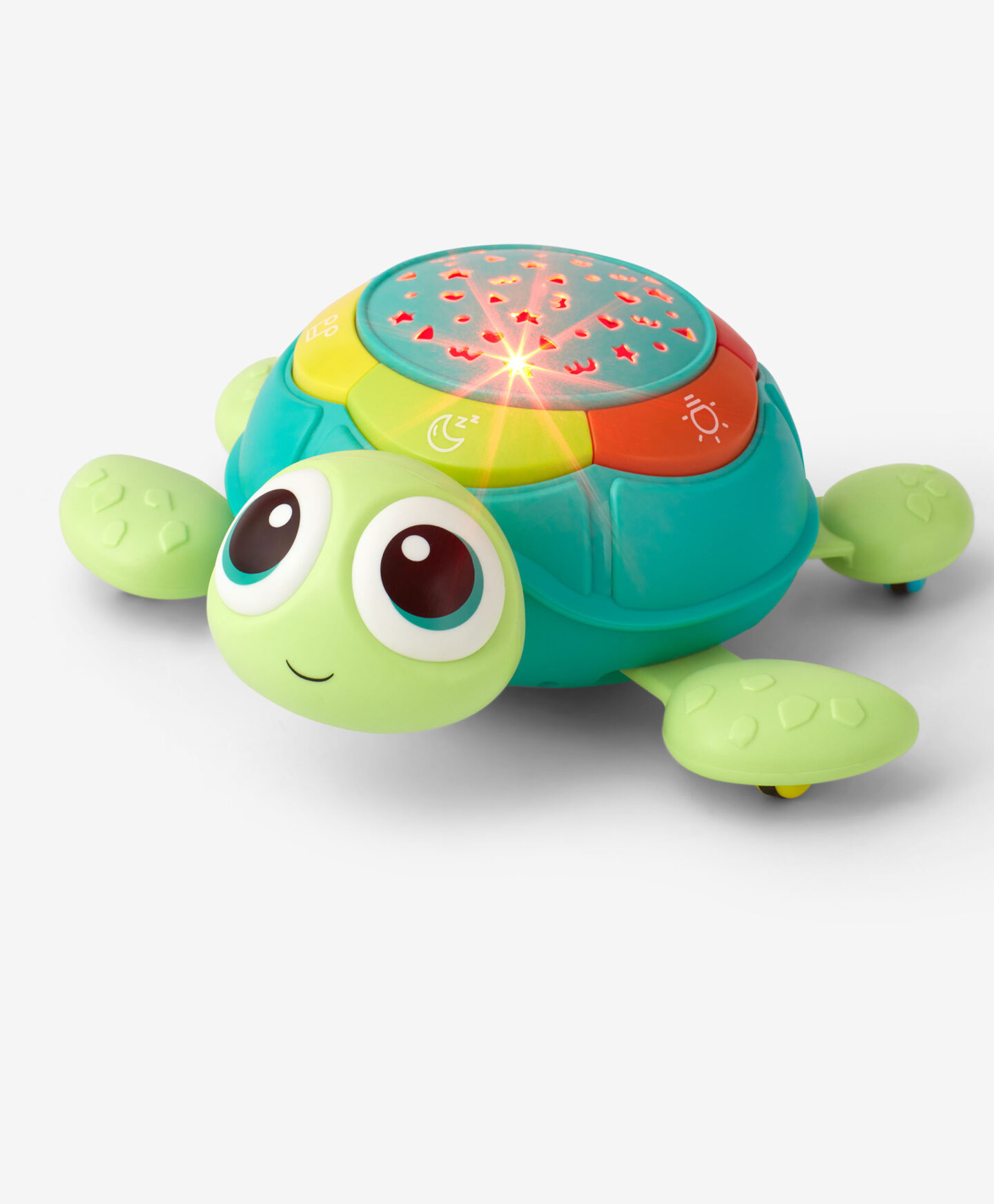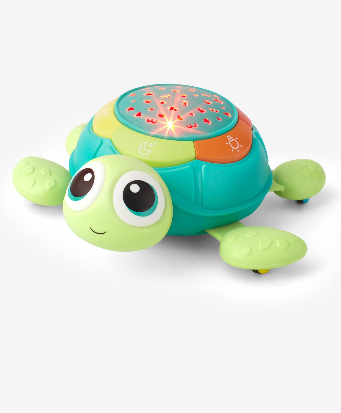 Pohyblivý projektor želva kombinuje funkci pohyblivé hračky se zobrazením světelných efektů. Během hry se želva pohybuje dopředu a zároveň promítá světelné vzory, které přitahují pozornost dítěte. Hračka stimuluje zrak a podporuje fyzickou aktivitu. Baterie jsou součástí balení.