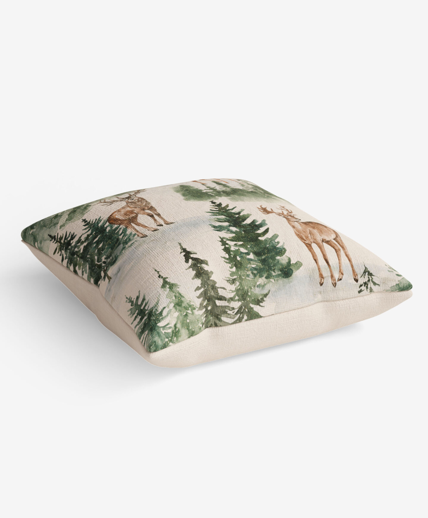 Dekorativní polštářek s motivem zimního lesa s vánočními stromky a jeleny, potěší krásným vzorem. Je to doplněk, který je vhodný jako dekorativní prvek i jako pohodlná opora pro relaxaci.