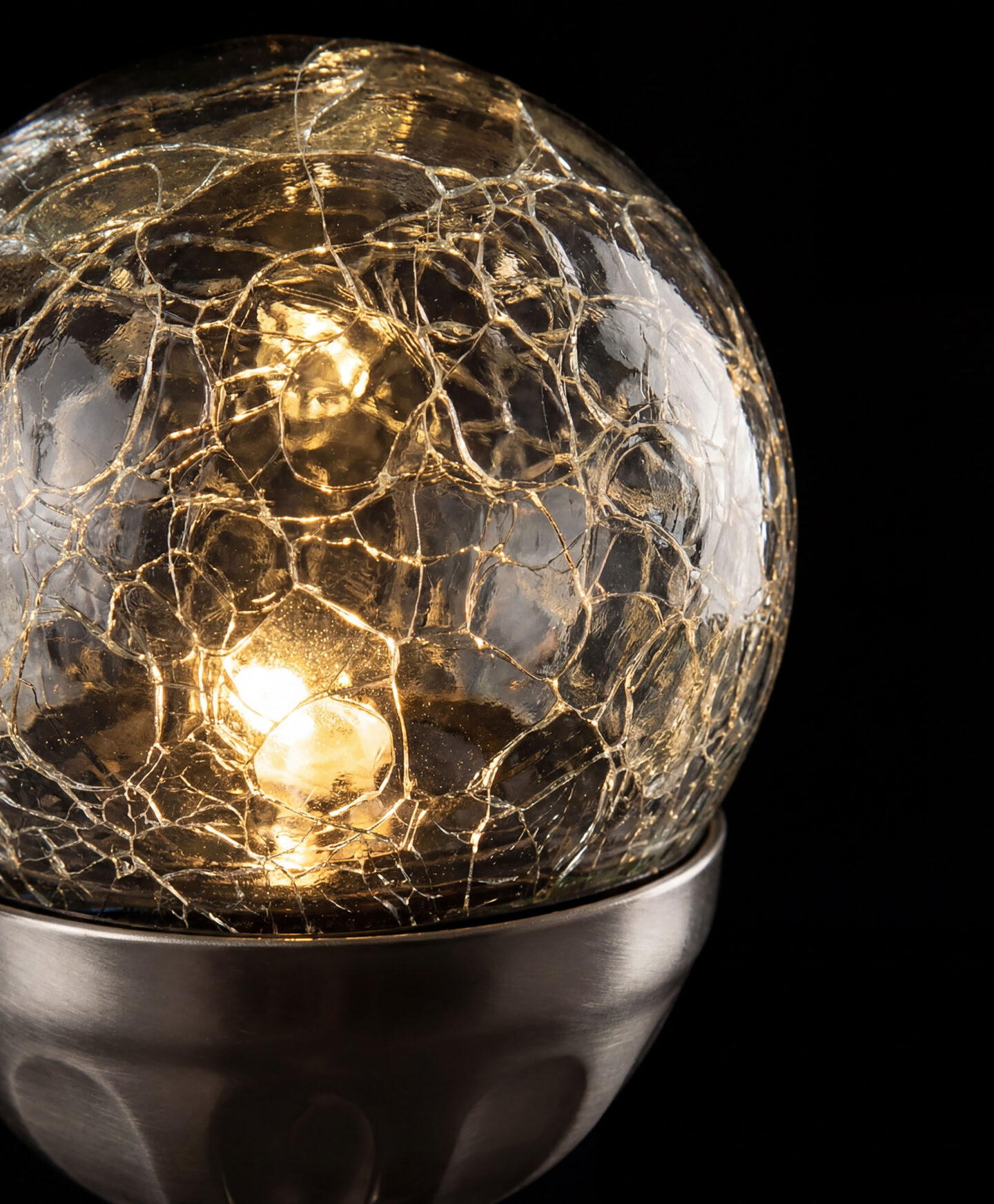 Solární koule s efektem prasklého skla je elegantní dekorace, která dodá šarm prostoru kolem vašeho domova. Ideální do zahrady, na balkon nebo terasu. Efekt prasklého skla na stínítku lampy rozptyluje světlo magickým způsobem. Světlo je napájeno solární energií díky vestavěnému solárnímu panelu, takže funguje bez kabelů a baterií. Automaticky se zapne za soumraku a vypne za úsvitu, čímž poskytuje bezúdržbové osvětlení po celou noc. Světlo je vyrobeno z materiálů odolných vůči povětrnostním vlivům, takže není ovlivněno vlhkostí, chladem ani UV zářením, což zaručuje dlouhodobé používání.