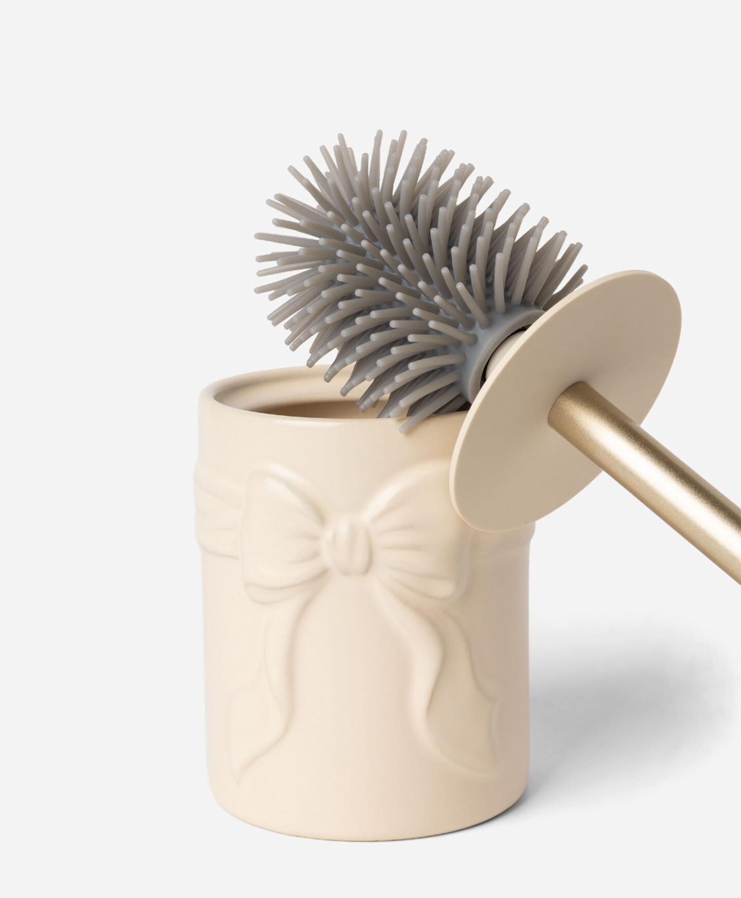 Toaletní kartáč s mašličkou je součástí soupravy s miskou na mýdlo, dávkovačem na mýdlo a držákem na zubní kartáček z nejnovější kolekce. Estetická úprava a jedinečný design se hodí do mnoha interiérových stylů. Kartáč se snadno udržuje v čistotě a ergonomická rukojeť usnadňuje každodenní používání.