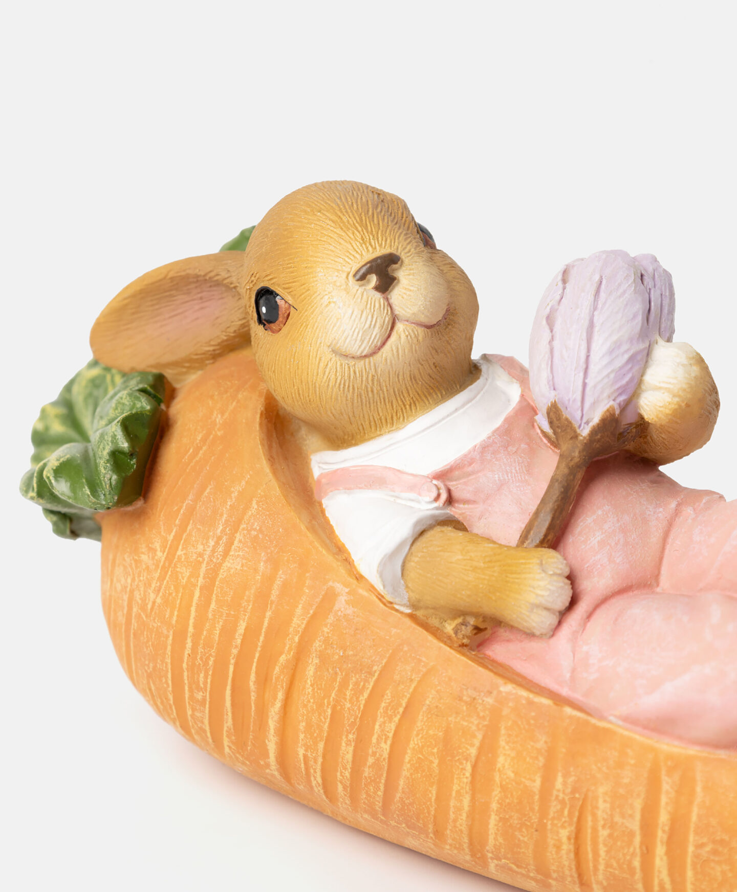 Dekorativní zajíček na mrkvi je dostupný v různých provedeních. Vyrobený z odolného, povětrnostním vlivům odolného polyresinu, je ideální pro zkrášlení vnitřních i vnějších prostor. Můžete jej umístit na balkon, terasu nebo mezi zahradní záhony.