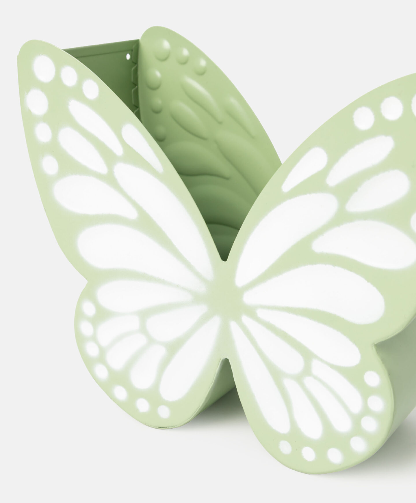 Zelený kovový květináč ve tvaru motýla