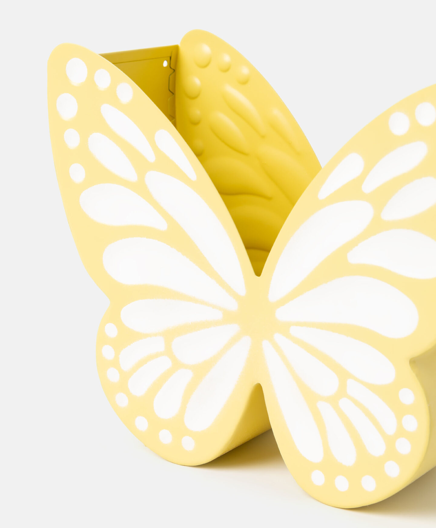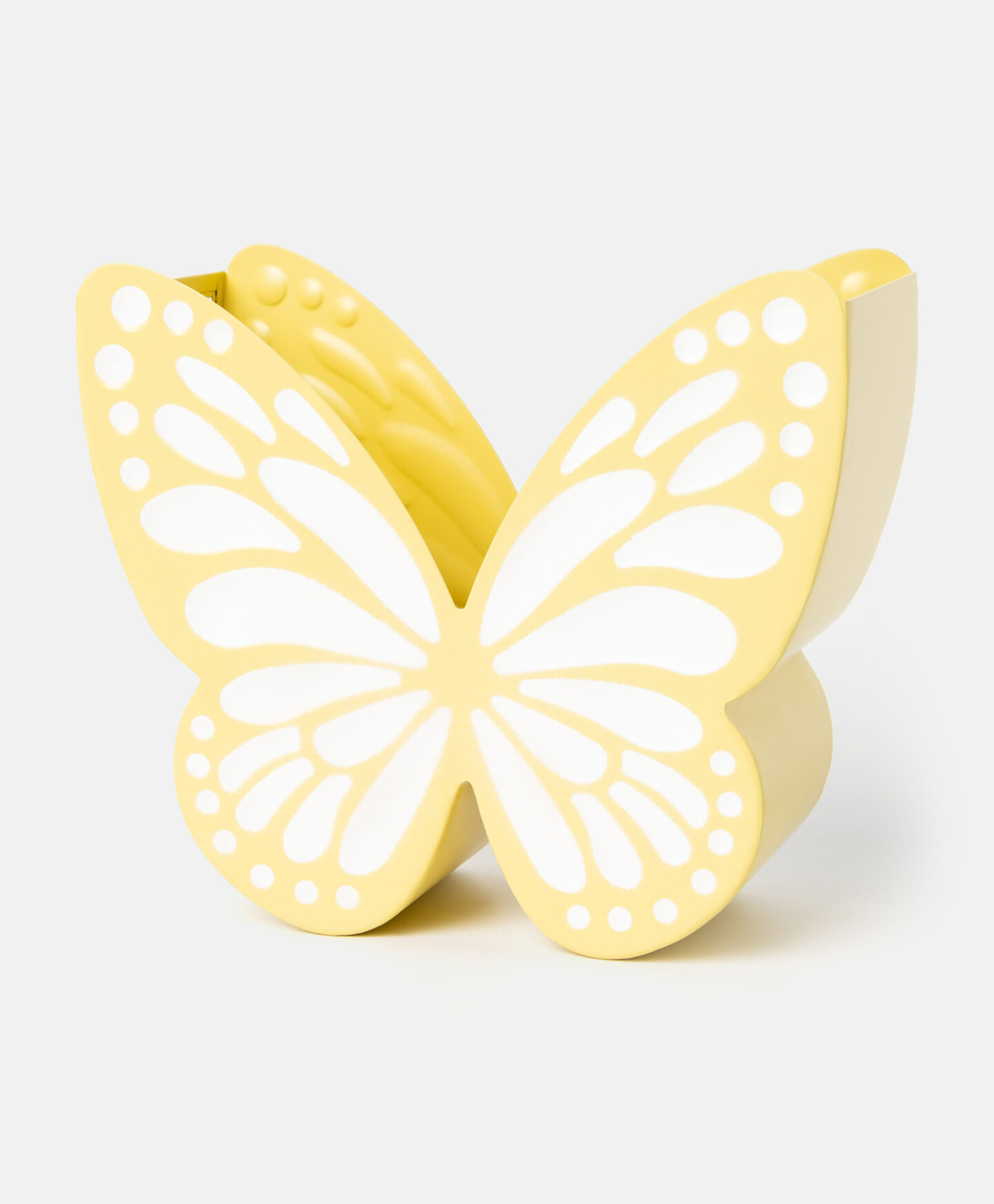 Žlutý kovový květináč ve tvaru motýla